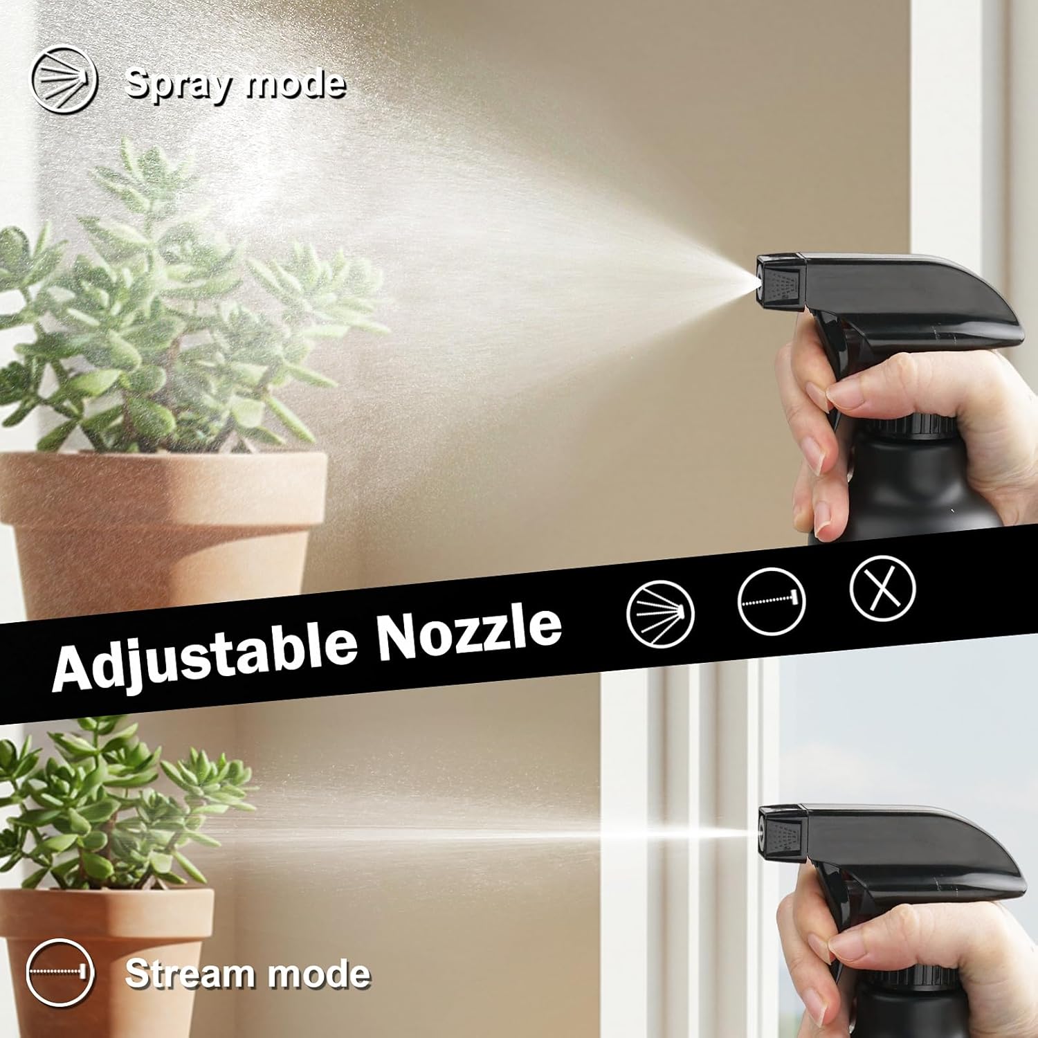 • ADJUSTABLE NOZZLE SPRAY BOTTLE: Rotate the nozzle to choose between a fine mist (gentle enough for delicate plants or hairstyling) and a targeted stream (ideal for deep cleaning or outdoor surfaces). The extended straw ensures efficient liquid use. An extra nozzle for you to replace.