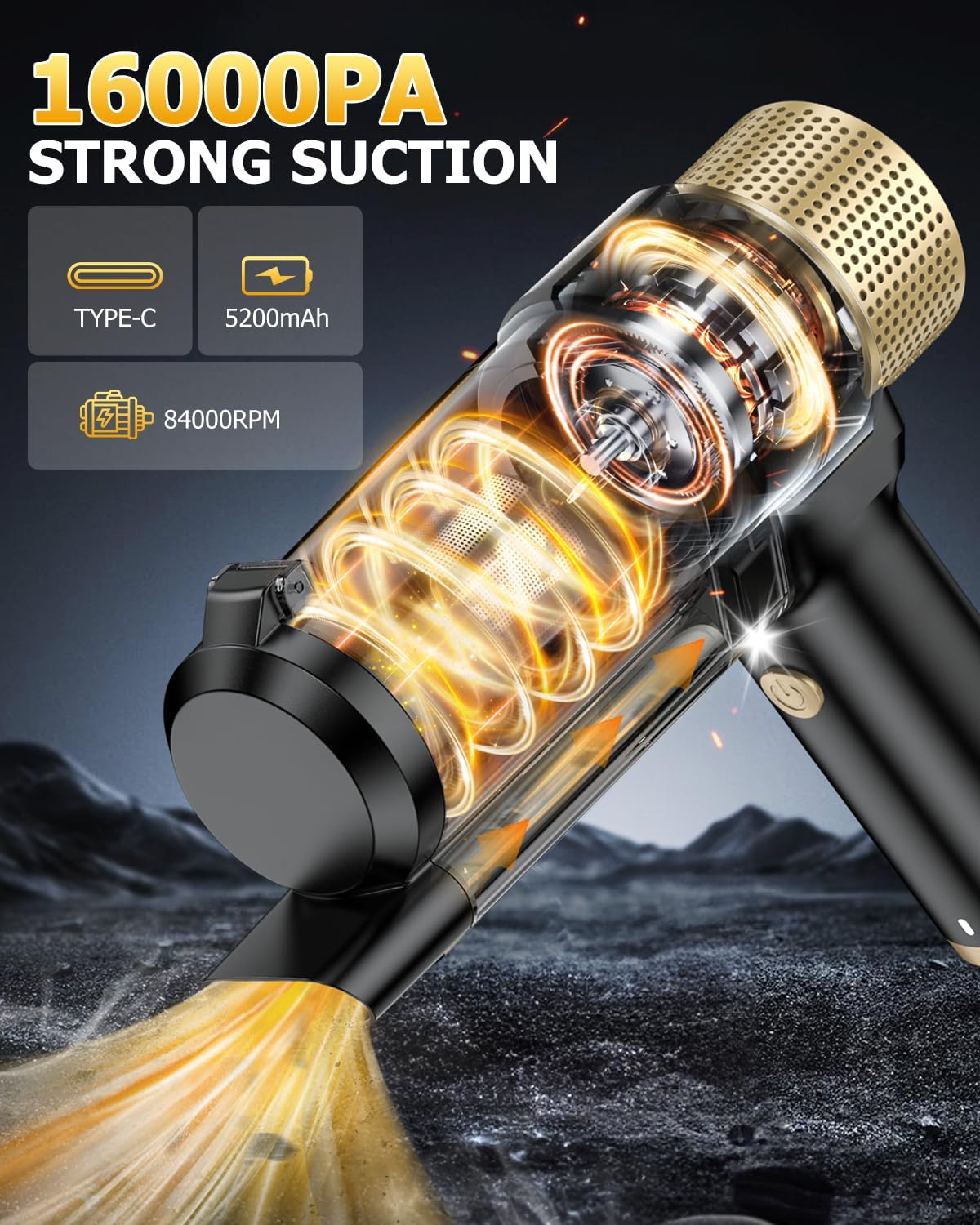 • 🌀【16000PA Suction Power】This car vacuum portable cordless features a strong suction power of 16,000 PA and a motor speed of 84,000 rpm, making it quick and easy to remove hard-to-tackle pet hair, fine debris, and other common dirt. Designed to meet your diverse cleaning needs, it efficiently handles various challenges whether at home, in the office, or in the car, taking the hassle out of tidying up