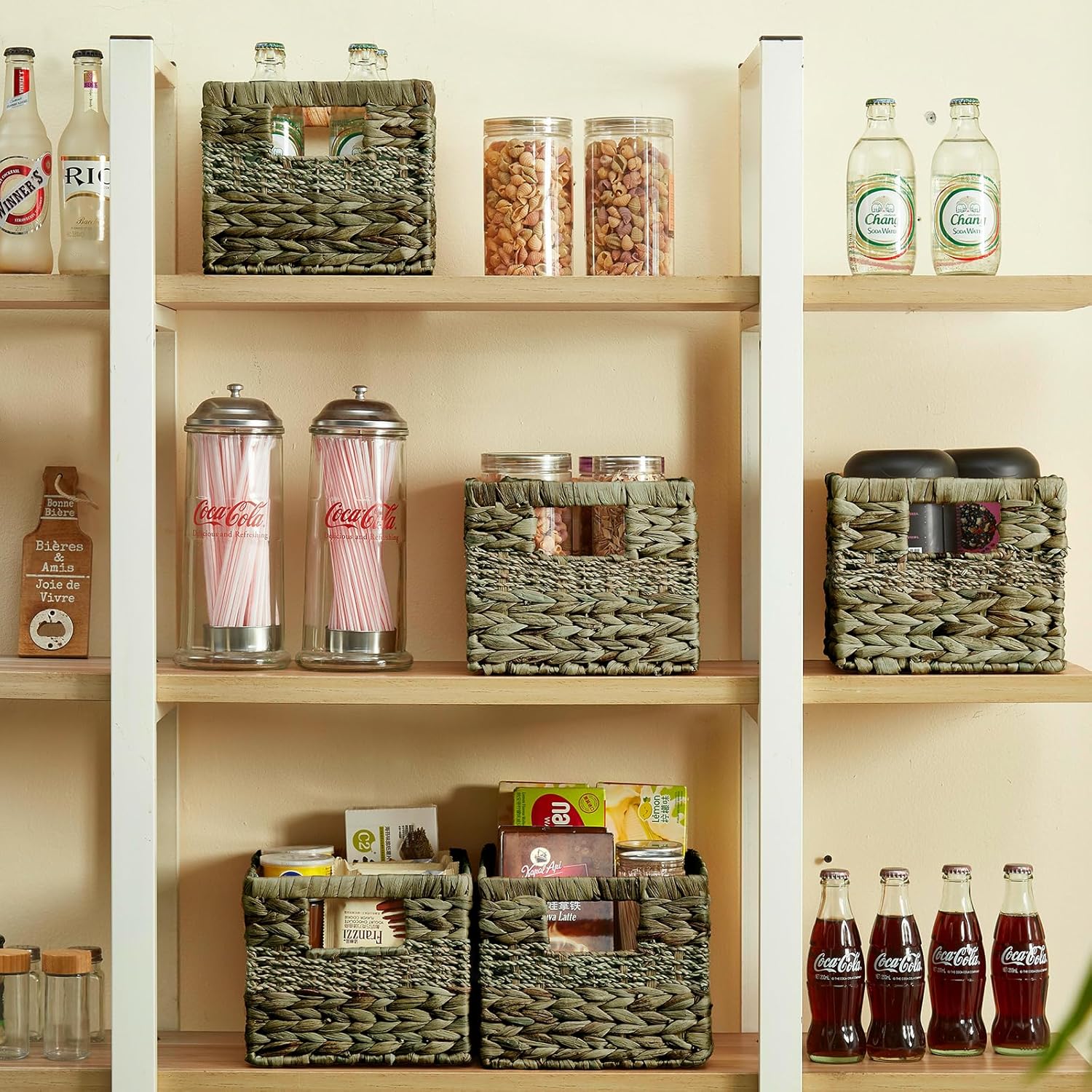 • ‎Chic Basket Design: With natural materials design, this water hyacinth and seagrass basket with built-in handles complements any home decor style. Shelf baskets' earthy tones and organic texture add a touch of warmth and charm to your living space, while its practical shape make it a functional addition to any room.
