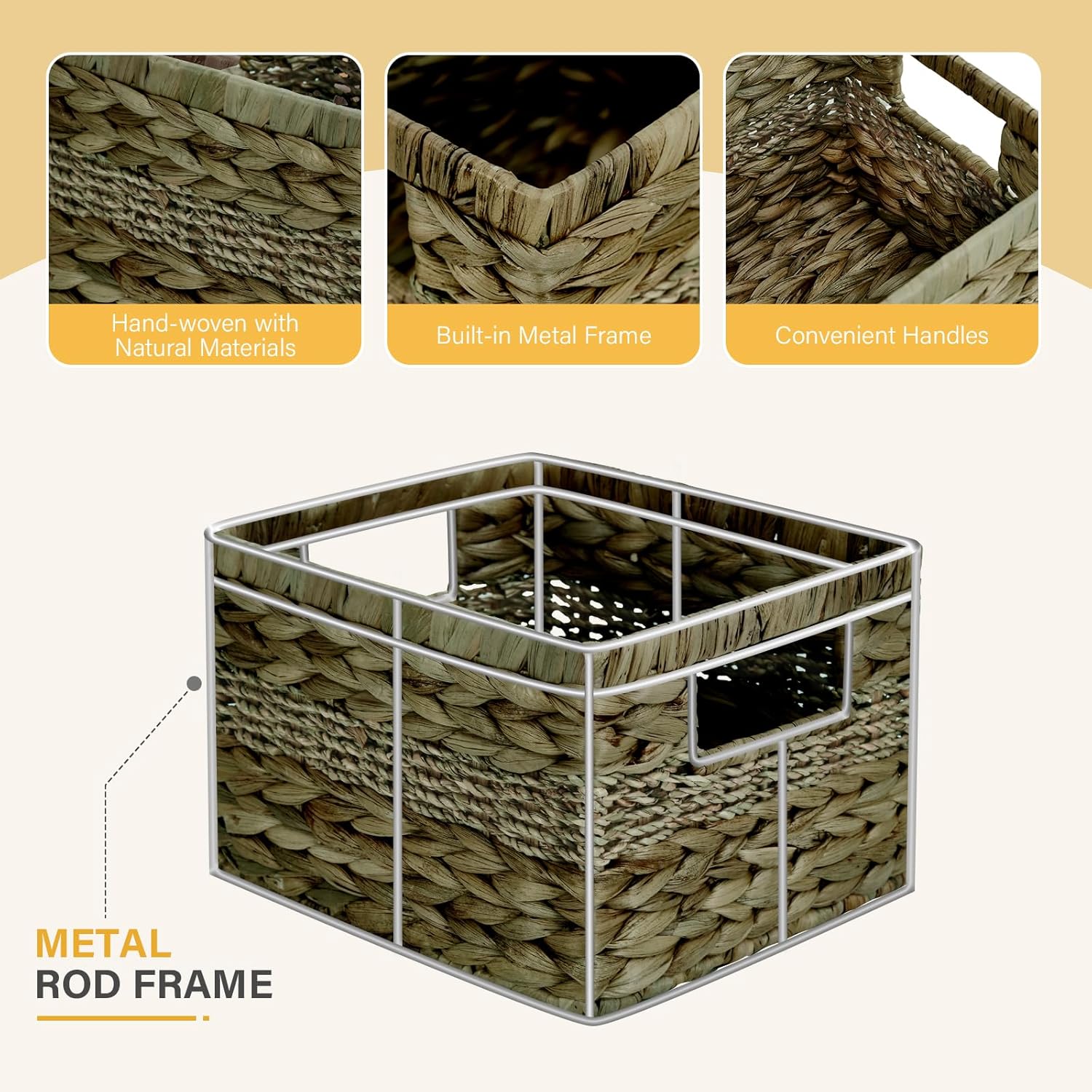 • Renewable Materials: Pantry organizers and storage crafted from a blend of water hyacinth and seagrass on a metal fram, harmonizes strength with organic texture. The 100% natural materials of woven basket ensure a guilt-free purchase, while the artisanal woven pattern adds rustic elegance to modern or minimalist spaces.