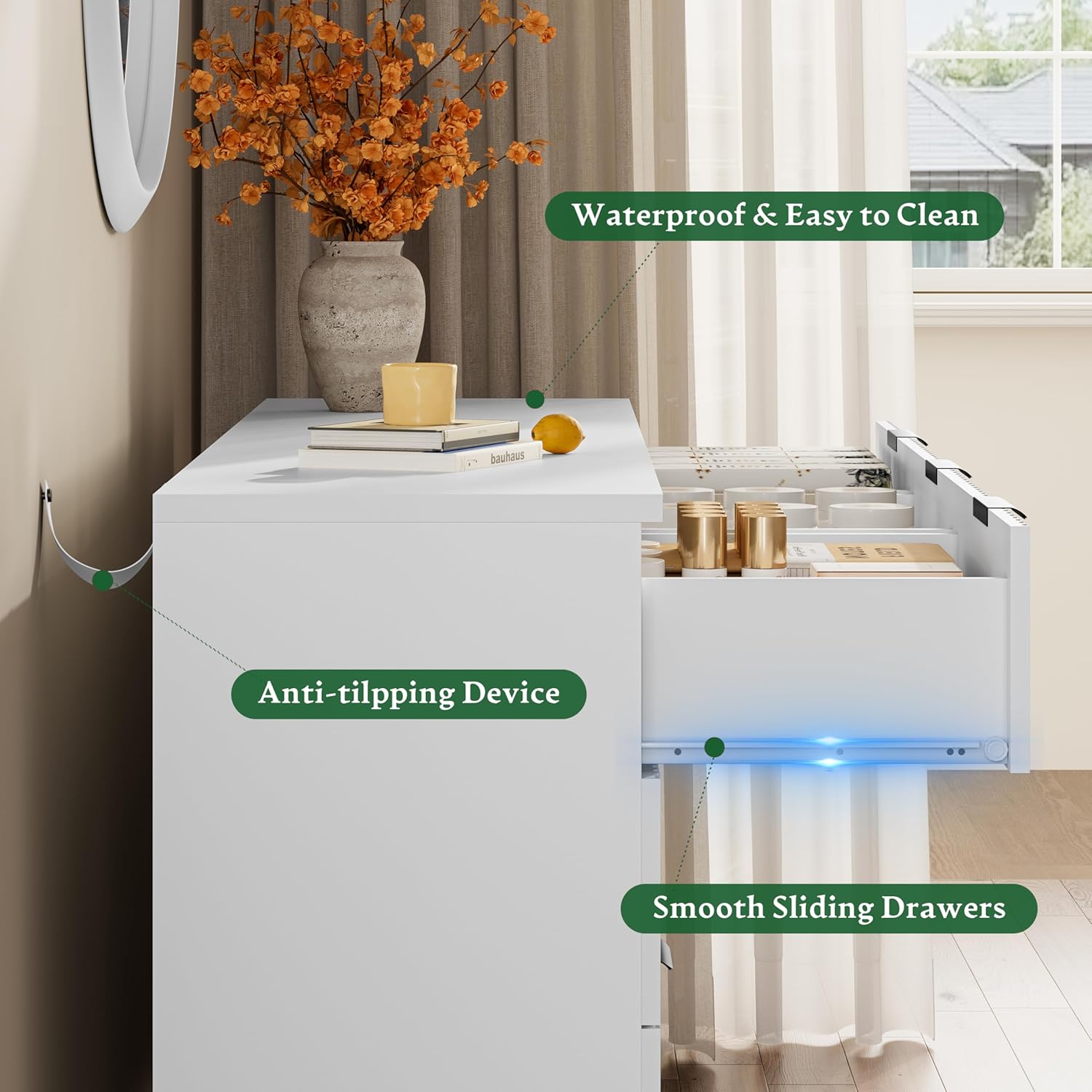 • 【Solid Material & Study Construction】The dressers & chests of drawers are constructed from optimal MDF, P2 engineered wood and coated metal handles which not only have exquisite texture, but also ensure long-term use and are scratch resistant. Each drawer holds up to 15 lbs or 35 lbs and the thickened tabletop can support up to 150 lbs. For easy cleaning, just wipe with damp cloth and get it air-dried