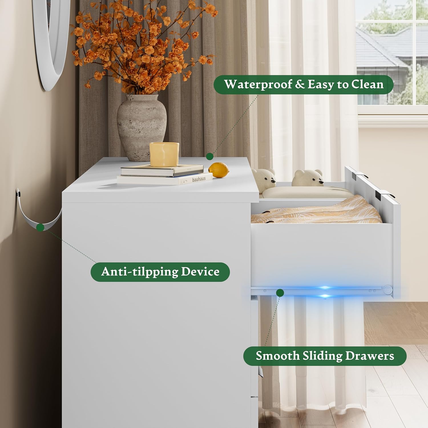 • 【Solid Material & Study Construction】The dressers & chests of drawers are constructed from optimal MDF, P2 engineered wood and coated metal handles which not only have exquisite texture, but also ensure long-term use and are scratch resistant. Each drawer holds up to 35 lbs and the thickened tabletop can support up to 150 lbs. For easy cleaning, just wipe with damp cloth and get it air-dried