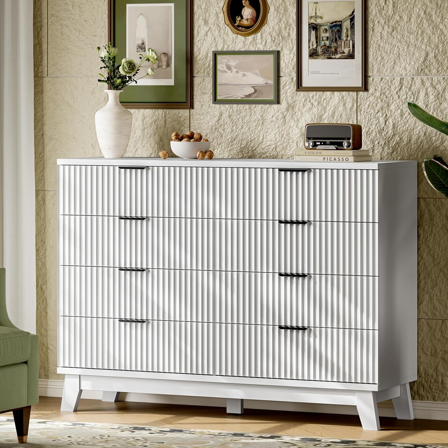 • 【Modern Chic Appearance】The unique wave-like fluted panel enhances the texture and elegance of this bedroom dresser. The thick table top features natural wood grain that complements the solid white finish. The wide metal handle and splayed base legs add a modern touch, creating a personalized and distinctive appearance