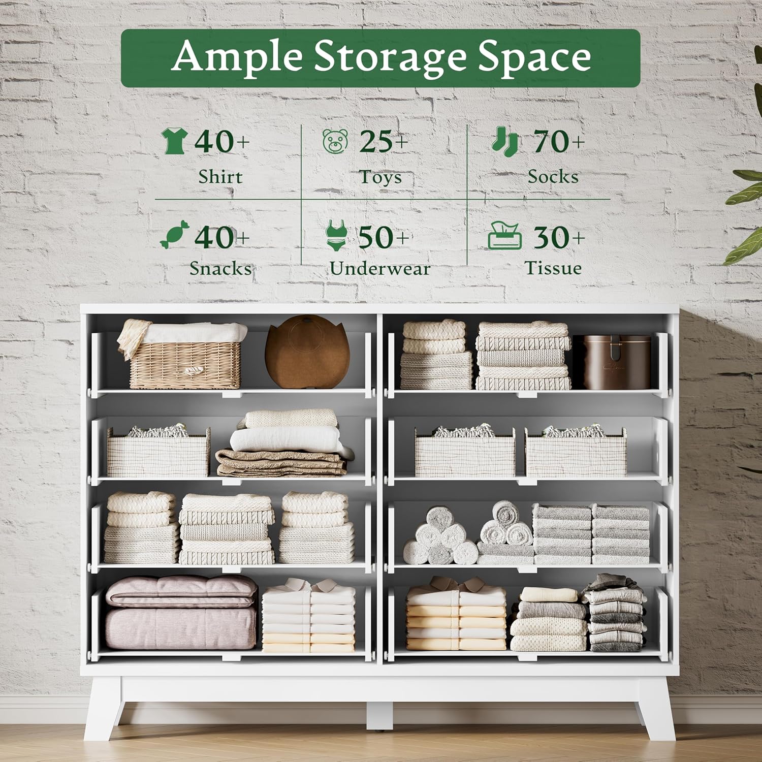 • 【Large Storage Capacity】The dresser for closet features 8 deep drawers that provide plenty of room for organizing clothing, bedding, cosmetics, or jewelry, helping you maintain a neat and tidy space. The wide wooden tabletop can serve as a dresser TV stand or display your decorations such as photo frames, plants or mirrors. Perfect for bedroom, living room, hallway, entryway