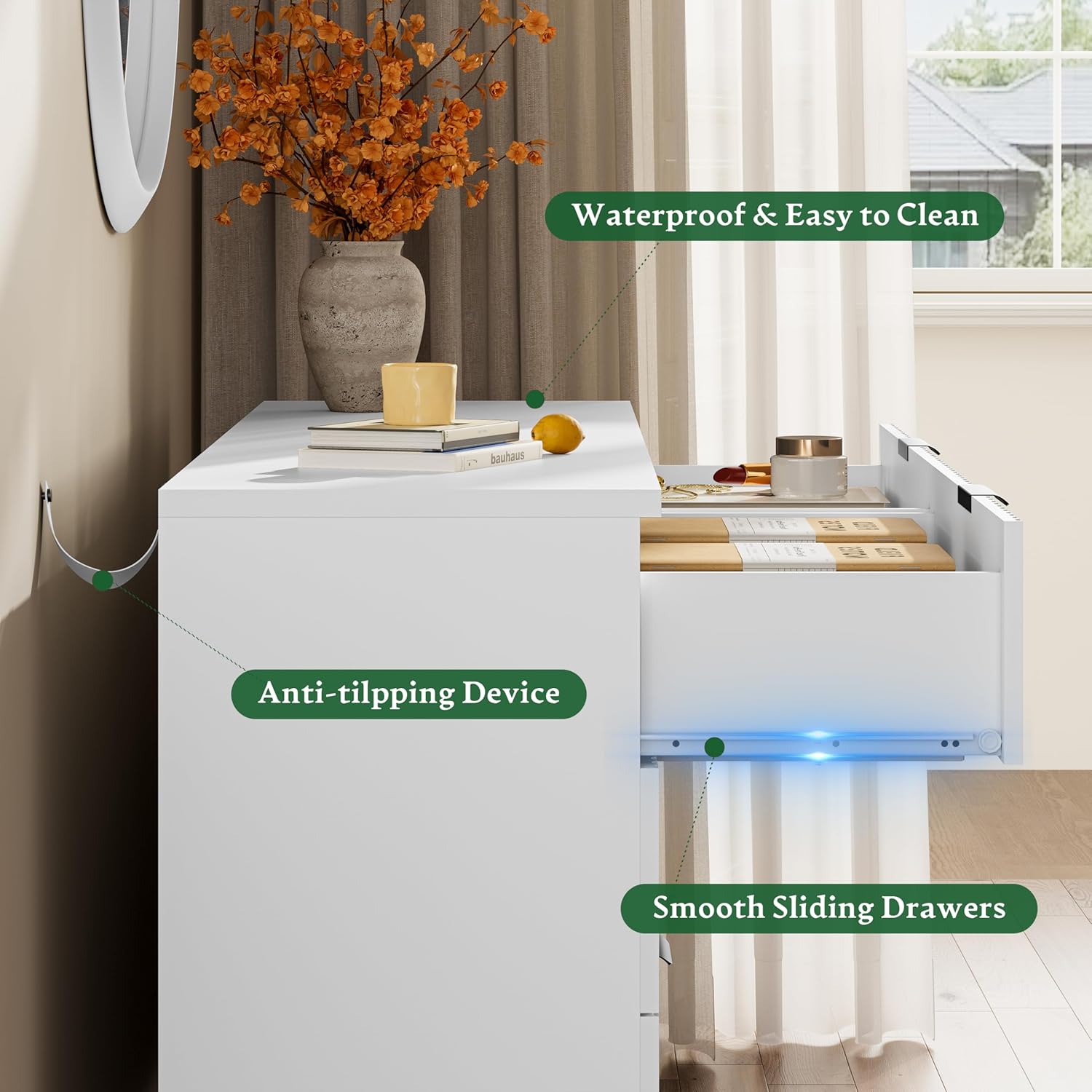 • 【Solid Material & Study Construction】The dressers & chests of drawers are constructed from optimal MDF, P2 engineered wood and coated metal handles which not only have exquisite texture, but also ensure long-term use and are scratch resistant. Each drawer holds up to 35 lbs and the thickened tabletop can support up to 150 lbs. For easy cleaning, just wipe with damp cloth and get it air-dried