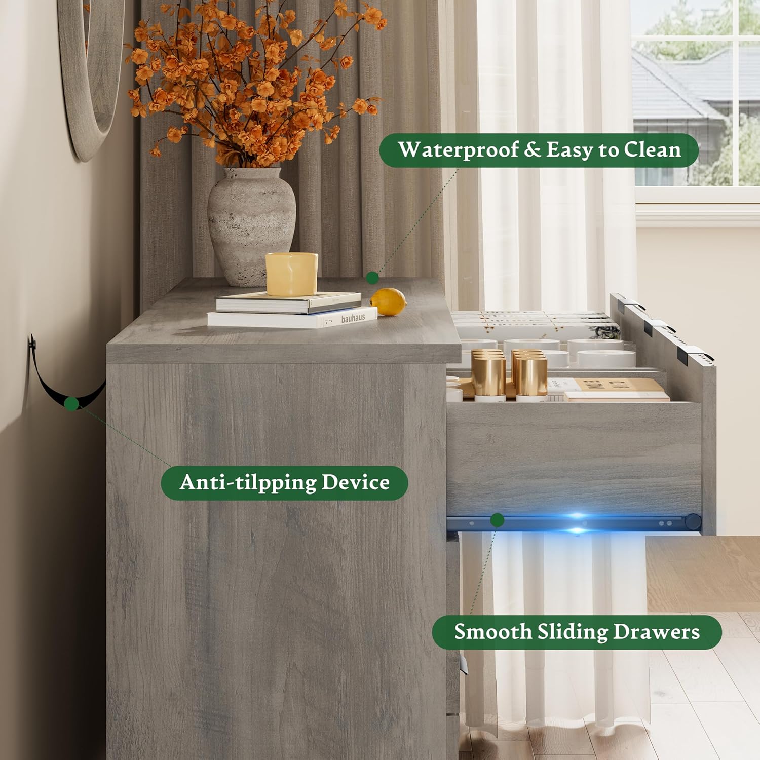 • 【Stability & Safety】The white/black/oak/grey dresser is equipped with an anti-tipping device, which can be fixed on the wall to prevent accidents. Each drawer contains a wide metal handle and built-in slide rail, easy to push and pull. Besides, the sturdy base provides this dresser with drawers a strong support and the middle feet can be adjustable to keep balance on uneven floors