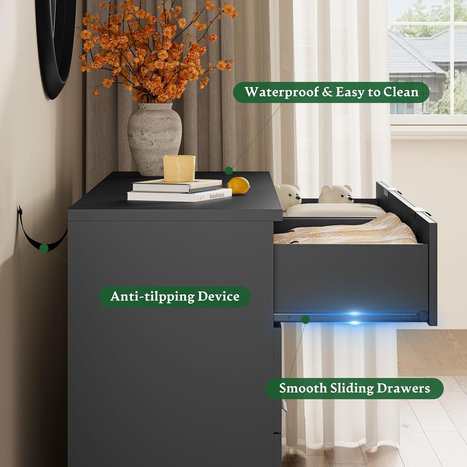 • 【Stability & Safety】The white/black/oak/grey dresser is equipped with an anti-tipping device, which can be fixed on the wall to prevent accidents. Each drawer contains a wide metal handle and built-in slide rail, easy to push and pull. Besides, the sturdy base provides this dresser with drawers a strong support and the middle feet can be adjustable to keep balance on uneven floors