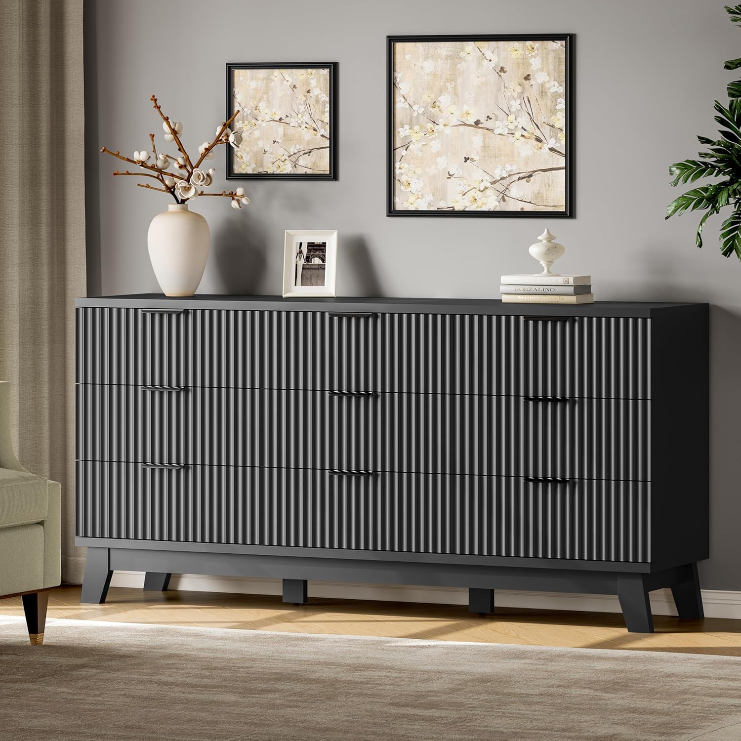 Fluted Dresser with 9 Drawers, 63" Wide Modern Chest of Drawers with Metal Handle, Wooden Dresser TV Stand, Wood Closet Clothes Storage Organizer for Bedroom, Living Room, Hallway, Solid Black