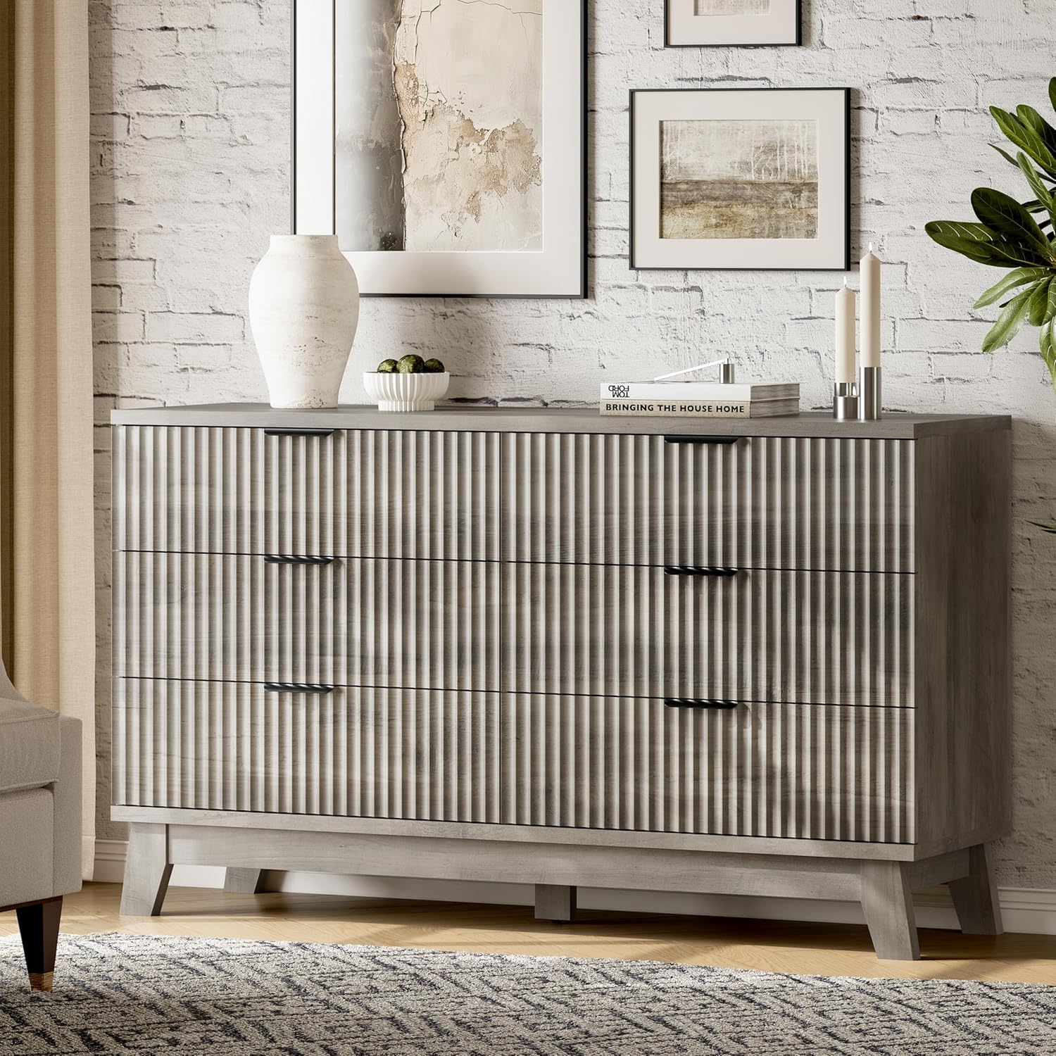 • 【Modern Chic Appearance】The unique wave-like fluted panel enhances the texture and elegance of this bedroom dresser. The thick table top features natural wood grain that complements the light grey finish. The wide metal handle and splayed base legs add a modern touch, creating a personalized and distinctive appearance