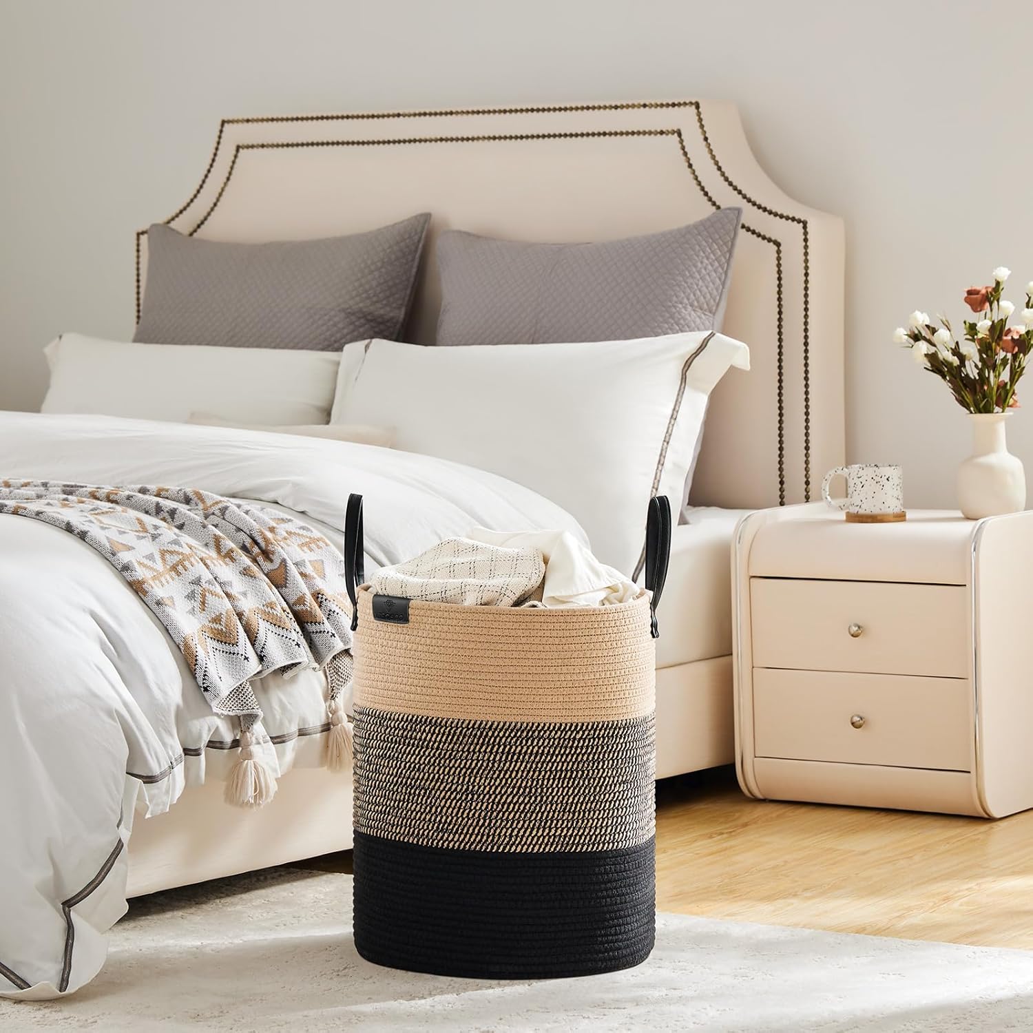 VIPOSCO Tall Laundry Basket, Large Dirty Clothes Hamper with Leather Handle, Woven Rope Storage Basket for Blanket, Toy In Living Room, Bathroom, Bedroom - 53L Brown & Black