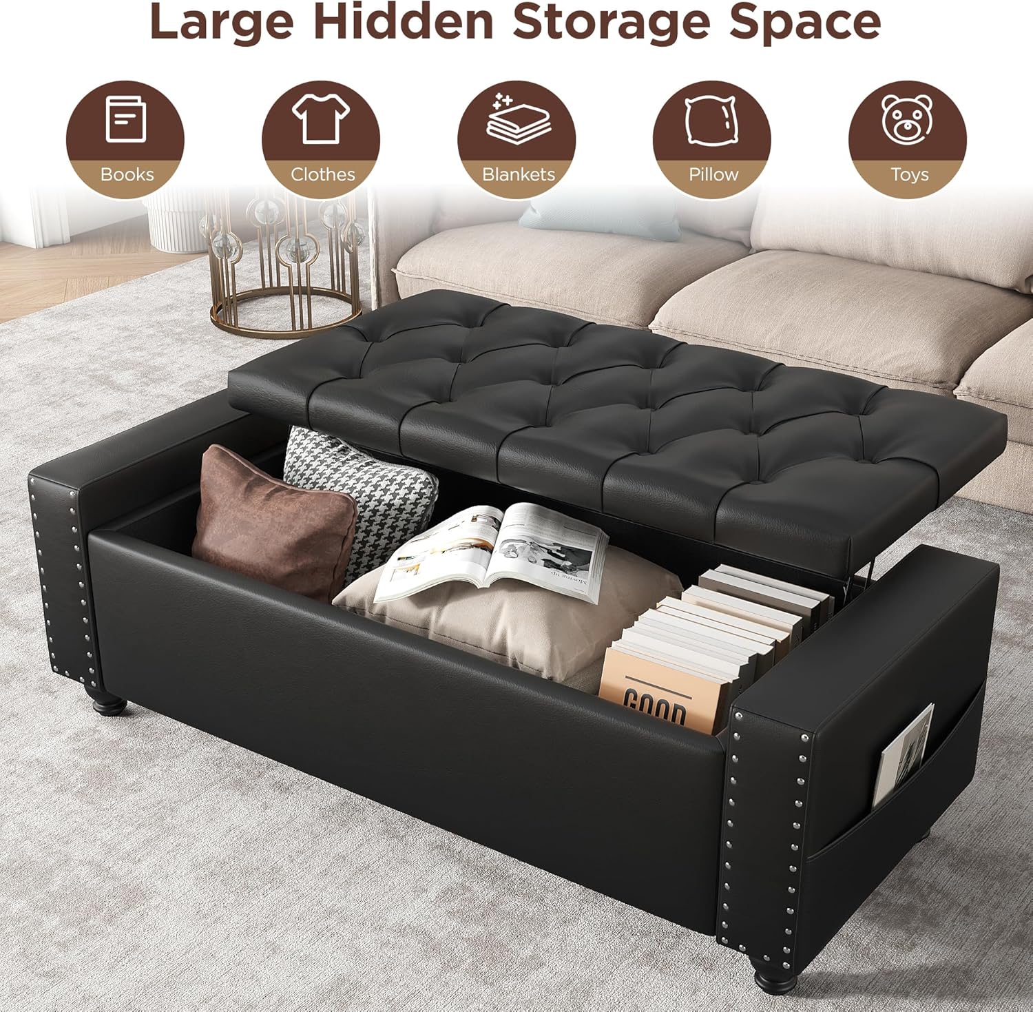 Maupvit Storage Ottoman Bench, 49 Inch Bedroom Bench, Upholstered Ottoman with Storage, Entryway Bench with Tufted Button, Faux Leather Window Bench for Bedroom, Living Room, Entryway, Hallway, Black