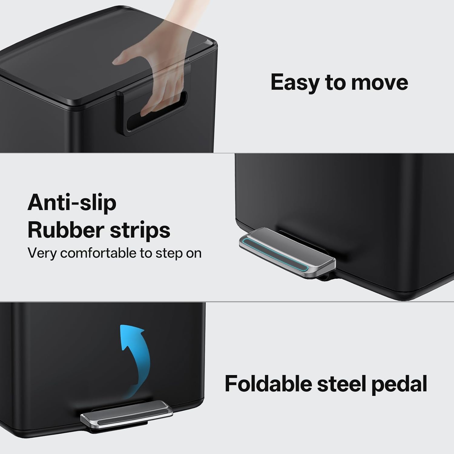 • Dwsign benefits: Garbage can with lid stays open, removable inner bucket, collapsable foot pedal and carrying handle, etc.