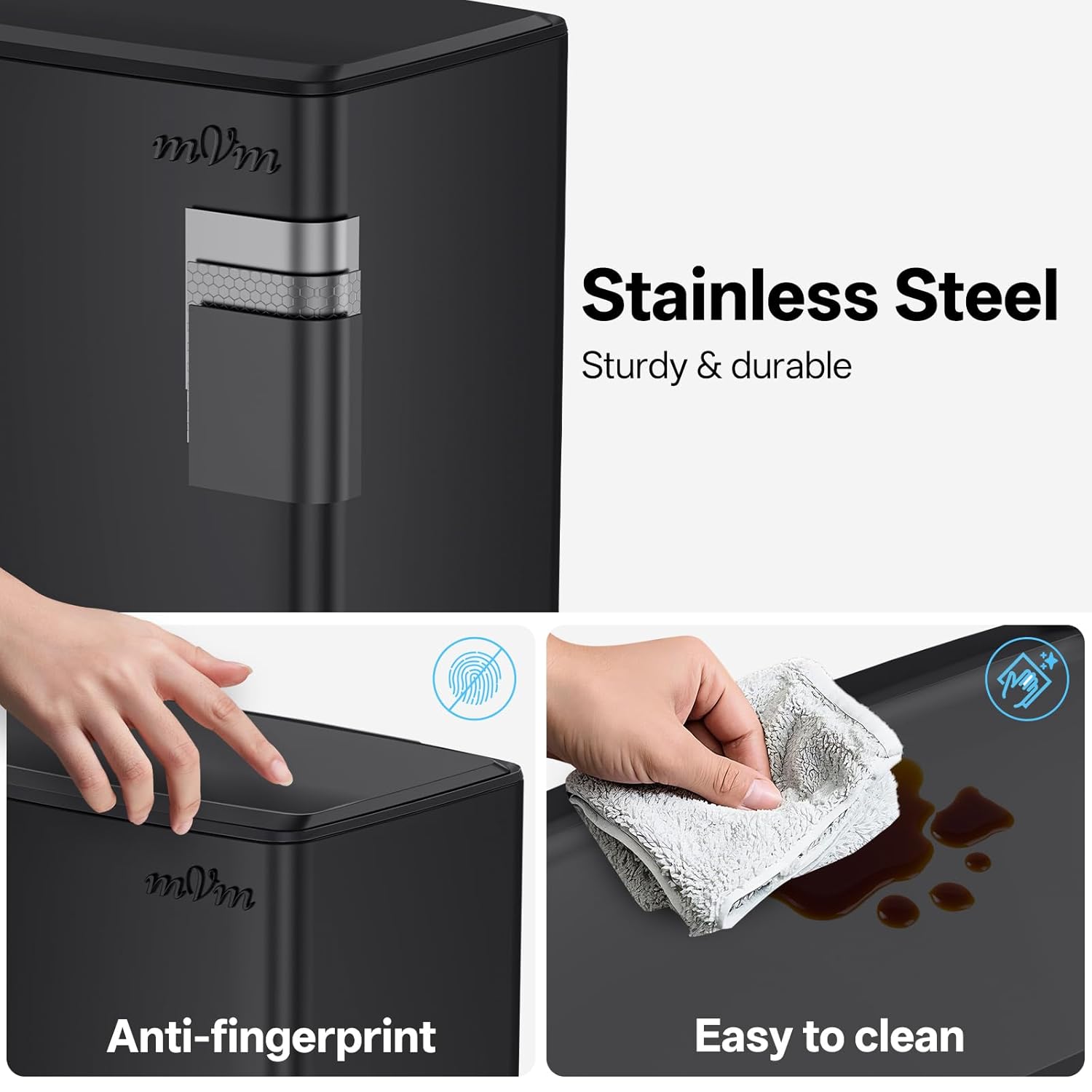 • Stainless steel: mVm trash can has a stainless steel surface, anti-fingerprint exterior and PP plastic inner bucket for reliable strength.
