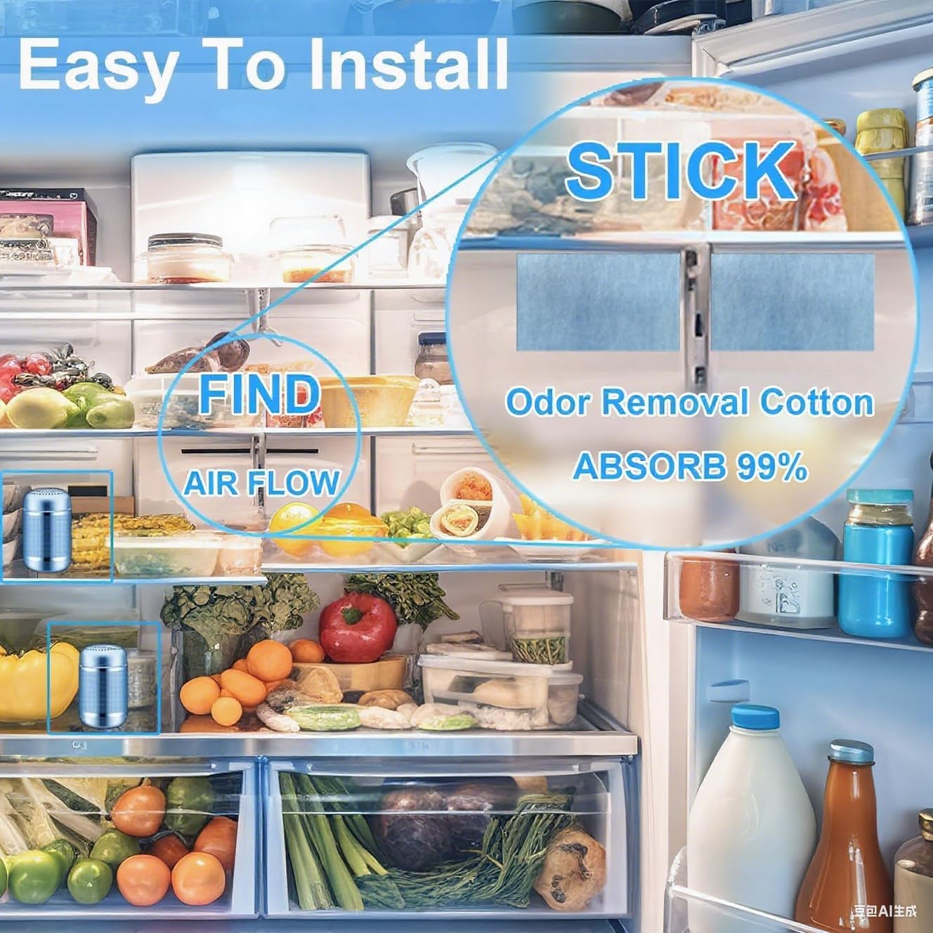 • More effective than baking soda: Simply place this fridge odor eliminator inside, attach the deodorizing cotton to the circulation vent, and it does the job—no power supply needed, never saturates, causes no secondary contamination, and is entirely free of fragrances and chemicals.