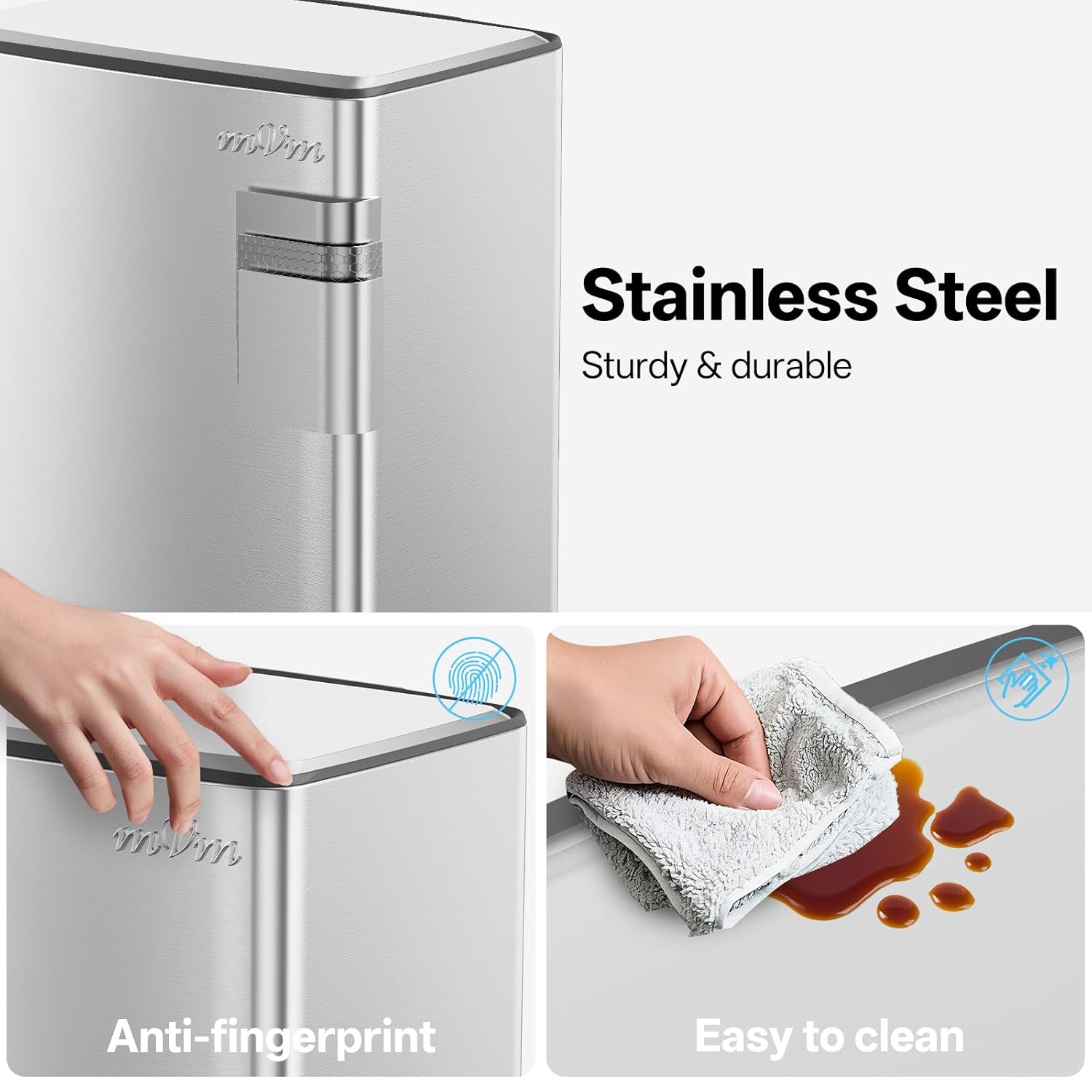 • Stainless steel: mVm trash can has a stainless steel surface, anti-fingerprint exterior and PP plastic inner bucket for reliable strength.