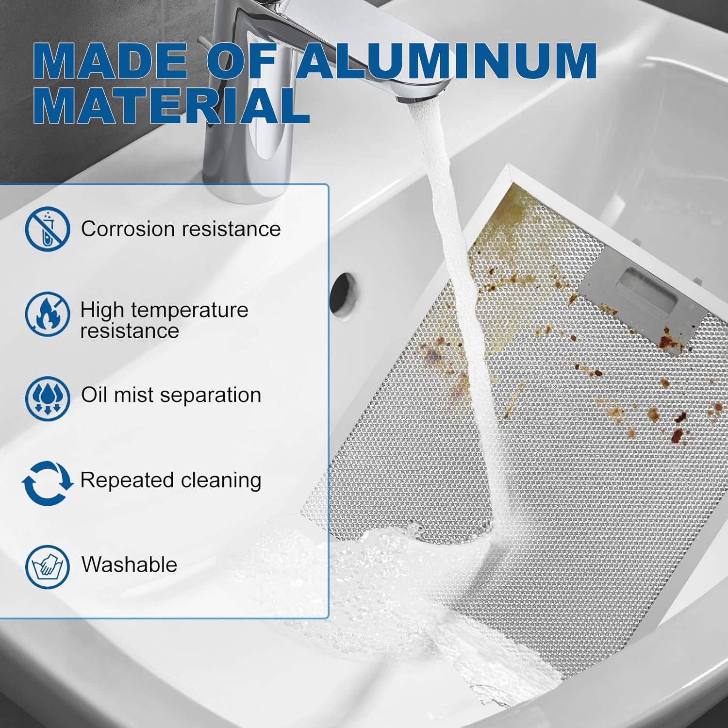 • ENHANCED FILTRATION: Our range hood filters feature an advanced 5-layer aluminum mesh design that effectively captures grease and cooking residue. Stove vent filter is expertly constructed and enhanced to be thicker than the industry standard enabling our hood filters for kitchen to stop more grease from entering.