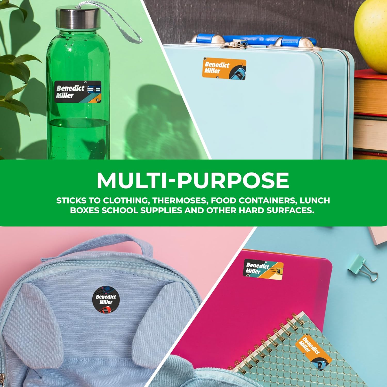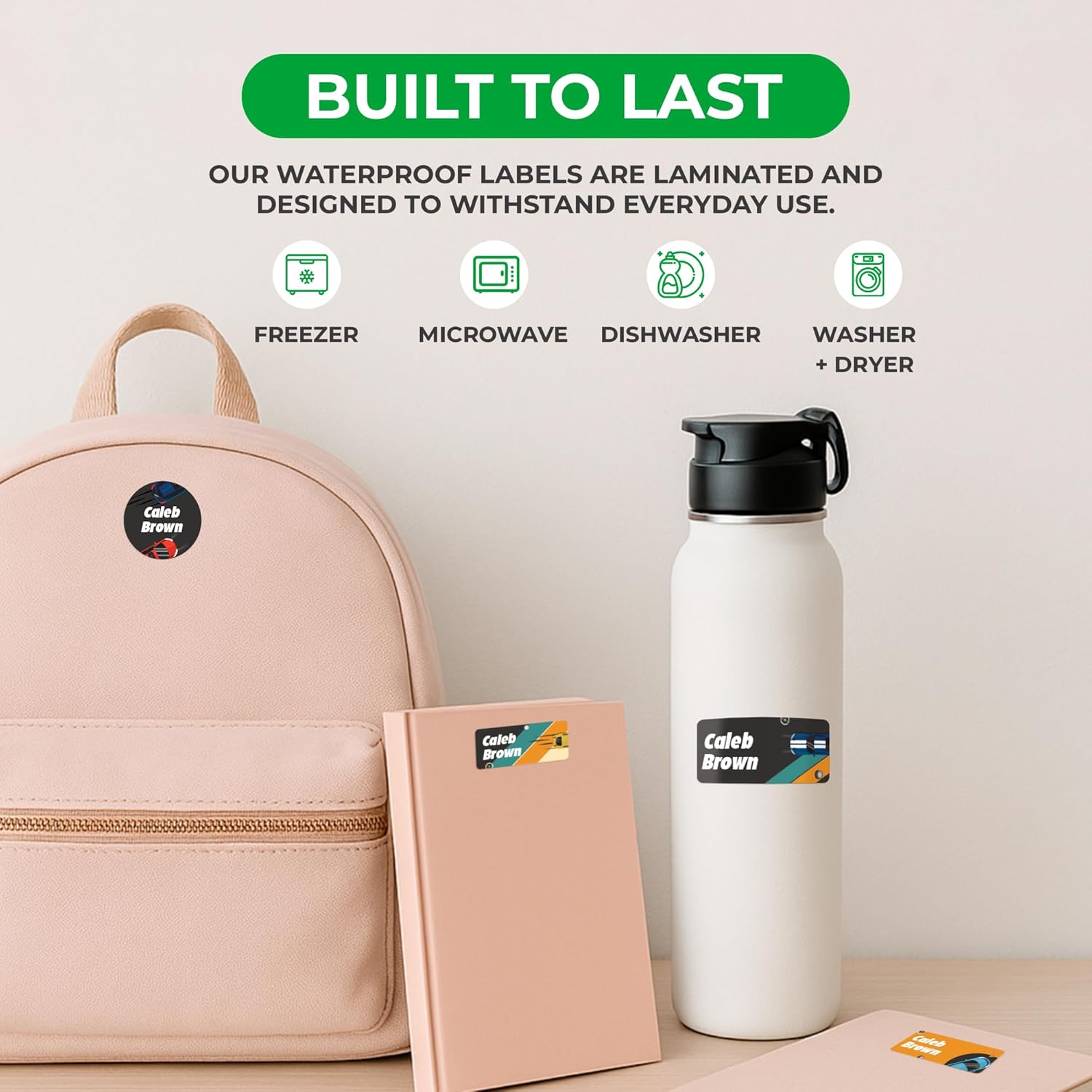 • 💧 Waterproof Stickers & Fade-Resistant — Laminated for long-lasting use, our custom stickers personalized won’t peel, fade, or rub off. Keep your kid’s name visible no matter where the day takes them. These waterproof vinyl labels stick to bottles, lunch boxes, clothing, notebooks, and more. Designed to survive dishwashers, microwaves, freezers, and even washer/dryers!