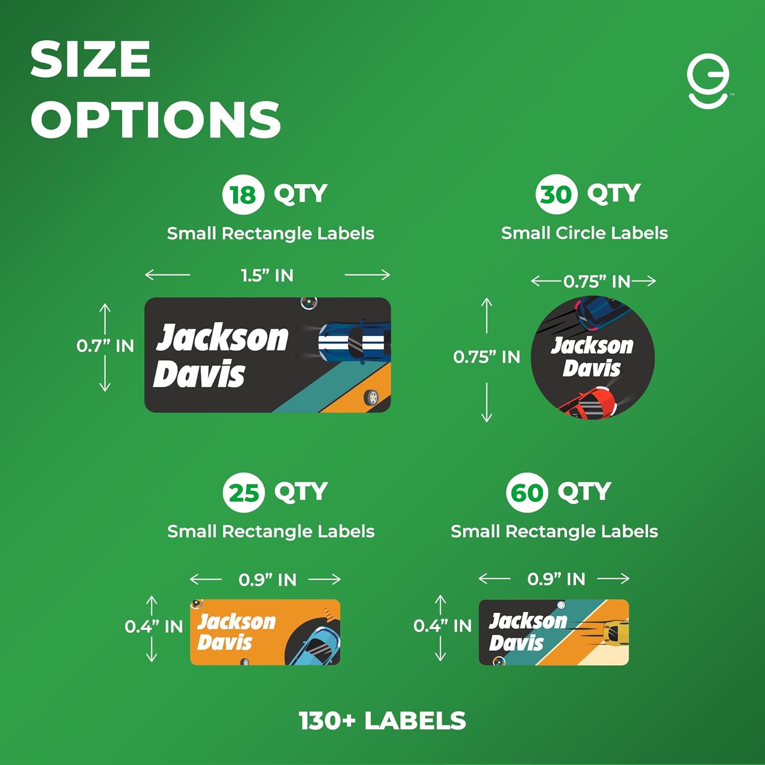 Personalized Name Tag Stickers for Kids (130+ Pack) | Car Waterproof Labels for School Supplies, Bottles & Lunch Boxes | Custom Vinyl Name Labels for Clothing, Toys & More (E. Cars)