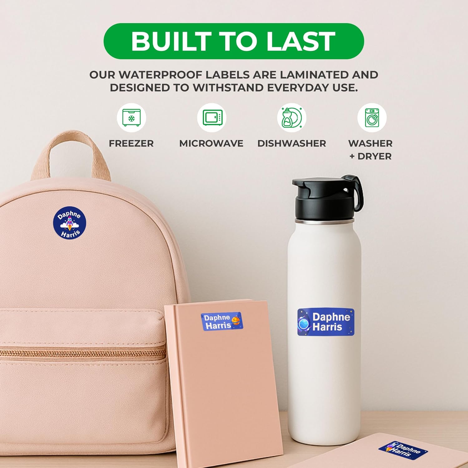 • 💧 Waterproof Stickers & Fade-Resistant — Laminated for long-lasting use, our custom stickers personalized won’t peel, fade, or rub off. Keep your kid’s name visible no matter where the day takes them. These waterproof vinyl labels stick to bottles, lunch boxes, clothing, notebooks, and more. Designed to survive dishwashers, microwaves, freezers, and even washer/dryers!