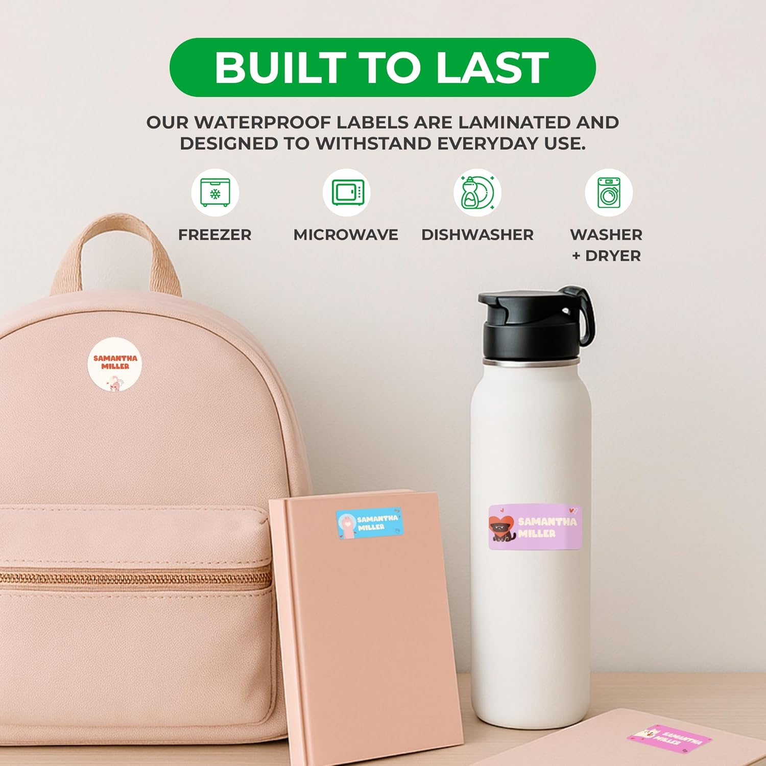 • 💧 Waterproof Stickers & Fade-Resistant — Laminated for long-lasting use, our custom stickers personalized won’t peel, fade, or rub off. Keep your kid’s name visible no matter where the day takes them. These waterproof vinyl labels stick to bottles, lunch boxes, clothing, notebooks, and more. Designed to survive dishwashers, microwaves, freezers, and even washer/dryers!