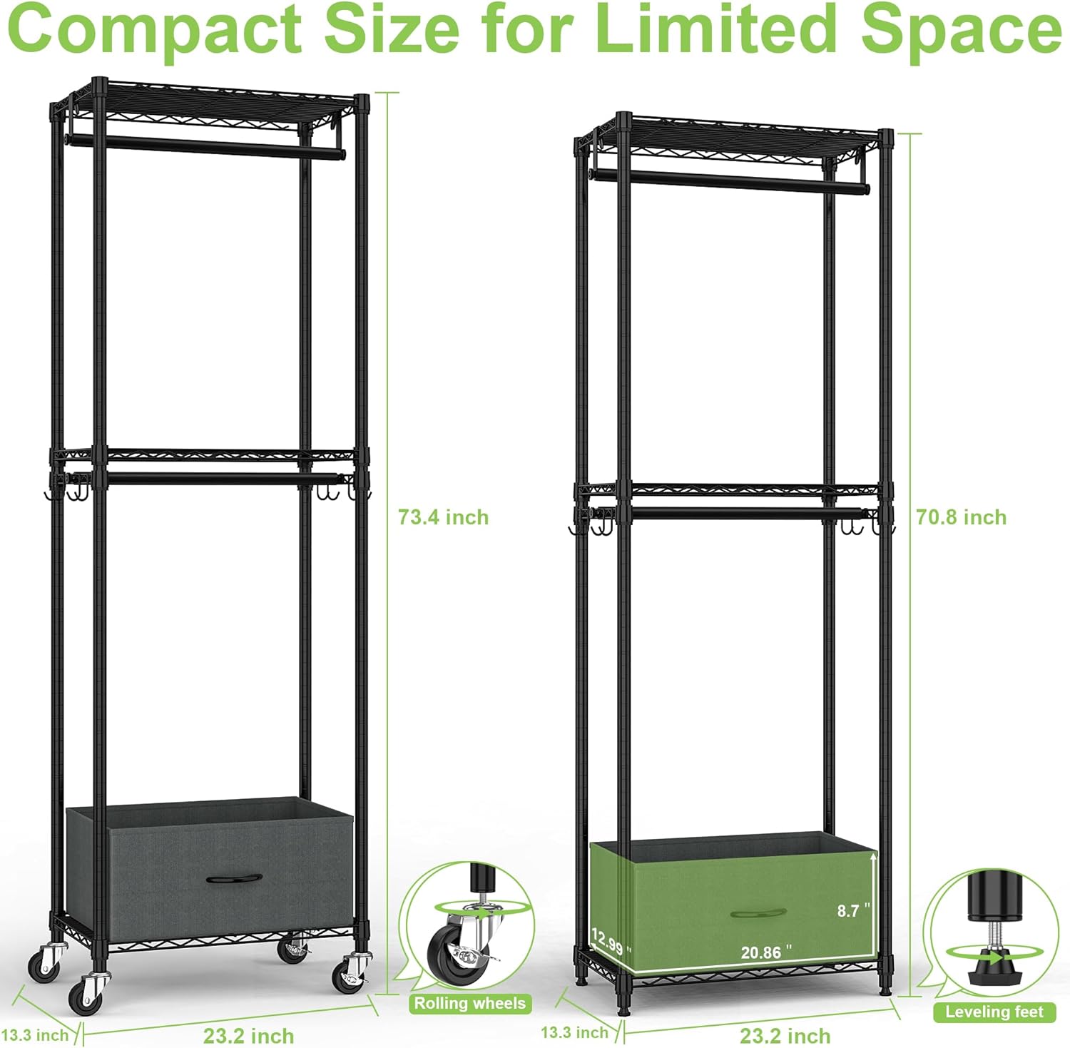 • Compact Size & Versatile Storage: Clothes Rack with Drawers measures 23.2 x 13.3 x 73.4 inches (with wheels) and features three shelves, two rods, one drawer, and two side hooks. It's perfect for organizing shirts, jackets, pants, underwear, boots/shoes, bags, luggage, and more without taking up too much space.