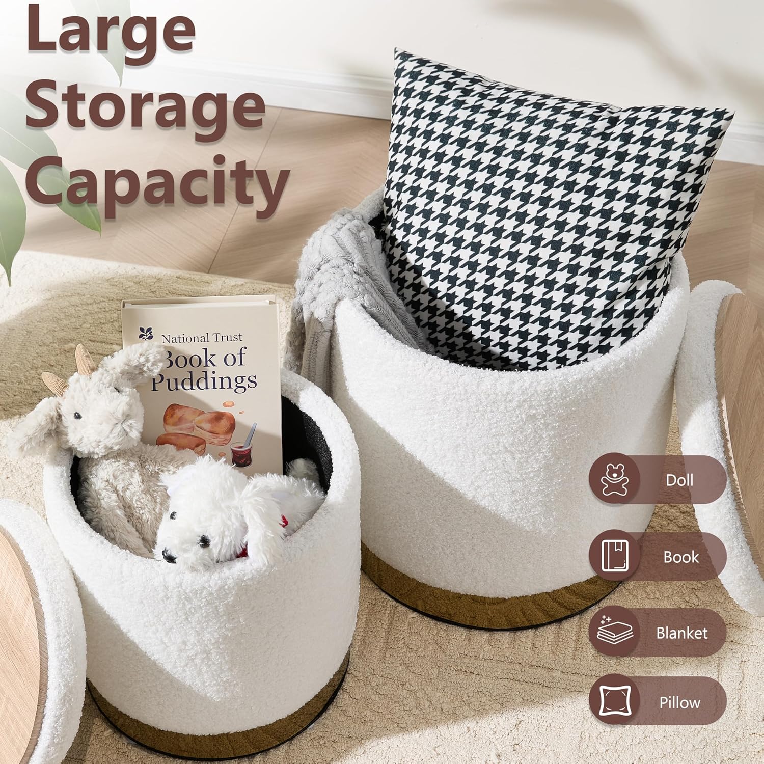• 【Perfect Space-Saving Set of 2】This round storage ottoman set includes two thoughtfully sized pieces designed to stack neatly together. The larger ottoman measures 14.76" x 14.76" x 17.32", while the smaller one is 12.6" x 12.6" x 14.17". This smart design offers a convenient space-saving solution, perfect for keeping your living room, bedroom, or entryway organized and clutter-free.