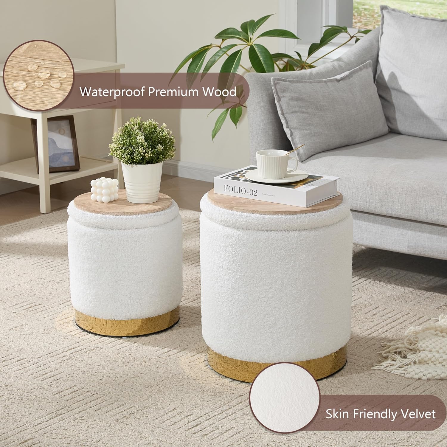Royal Windsor Boucle Round Ottoman with Storage Set of 2, Vanity Stool with Storage for Bedroom, Ottoman Coffee Table Gold-Tone Ring Around The Base, Small Foot Stool for Living Room, White