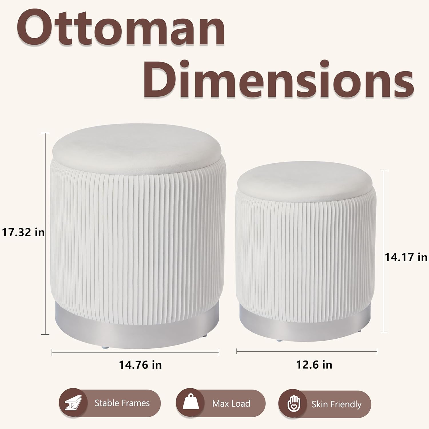 Royal Windsor Round Ottoman with Storage Set of 2, Vanity Stool with Storage for Bedroom, Ottoman Coffee Table Silver-Tone Ring Around The Base, Small Velvet Foot Stool for Living Room, White