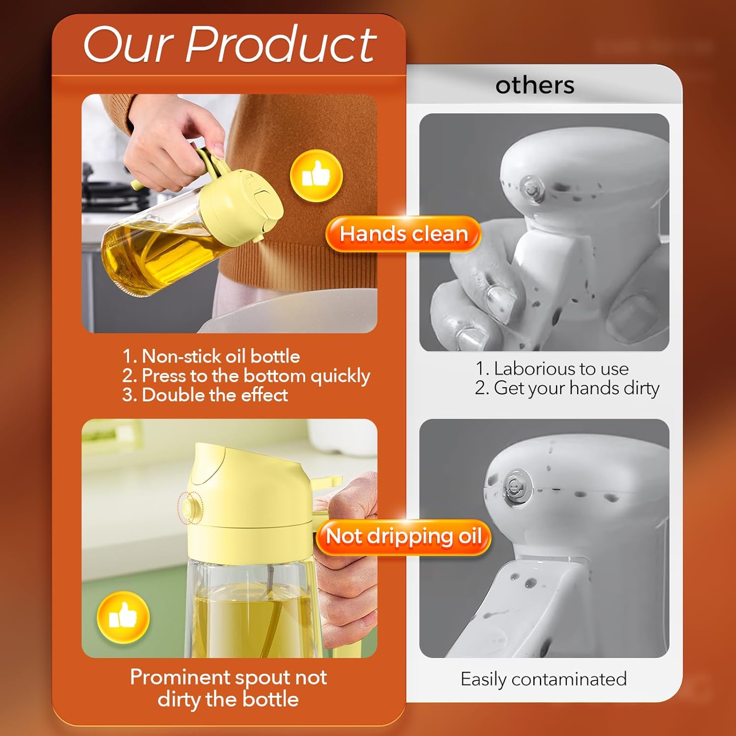 • Dual-Function Design & Multi-Purpose: Oil spray bottle for cooking offers the convenience of both spraying and pouring oil, suitable for a wide range of food preparation processes such as salad dressing, griddle, roasting, grilling, make your kitchen efficient and organized