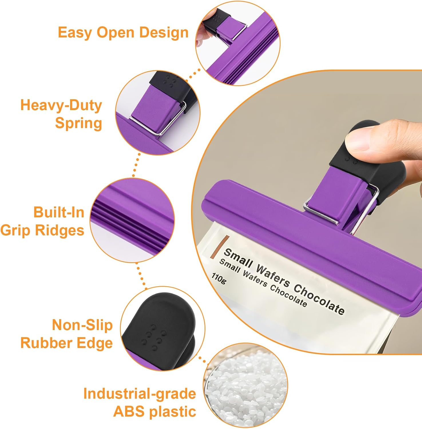 • 【High Quality Material】Food bag clips is made of high quality ABS+TPR+stainless steel material, which is sturdy and long-lasting. Powerful spring tension keeps bags sealed. Rubberized non-slip handle for comfortable grip and easy opening