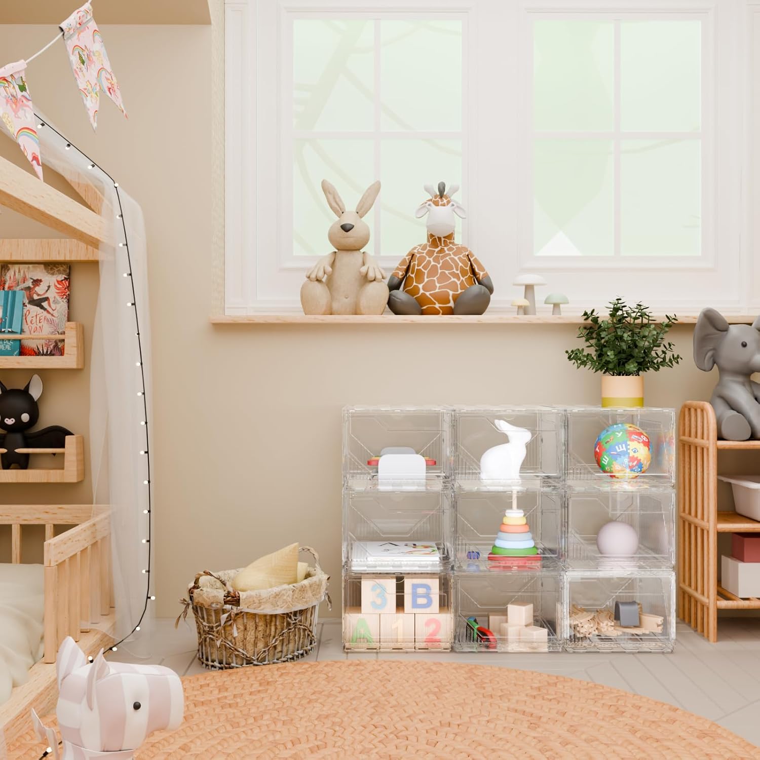 • Widely Applicable: Suitable for storing clothes, scarves, duckbill hats, fisherman hats, berets, towels, bath towels, small bags, etc. It can also be used to store bathroom products such as shower gel, hand sanitizer, aromatherapy candles, tissues, etc. This kitchen organizer can also accommodate kitchen supplies such as spice jars, garbage bags, cans, bagged coffee beans, etc It can also store toys like remote control vehicles, building blocks, train set and handmade tools, and DIY products like yarn skeins. Find right things through clear front door with a glimpse.