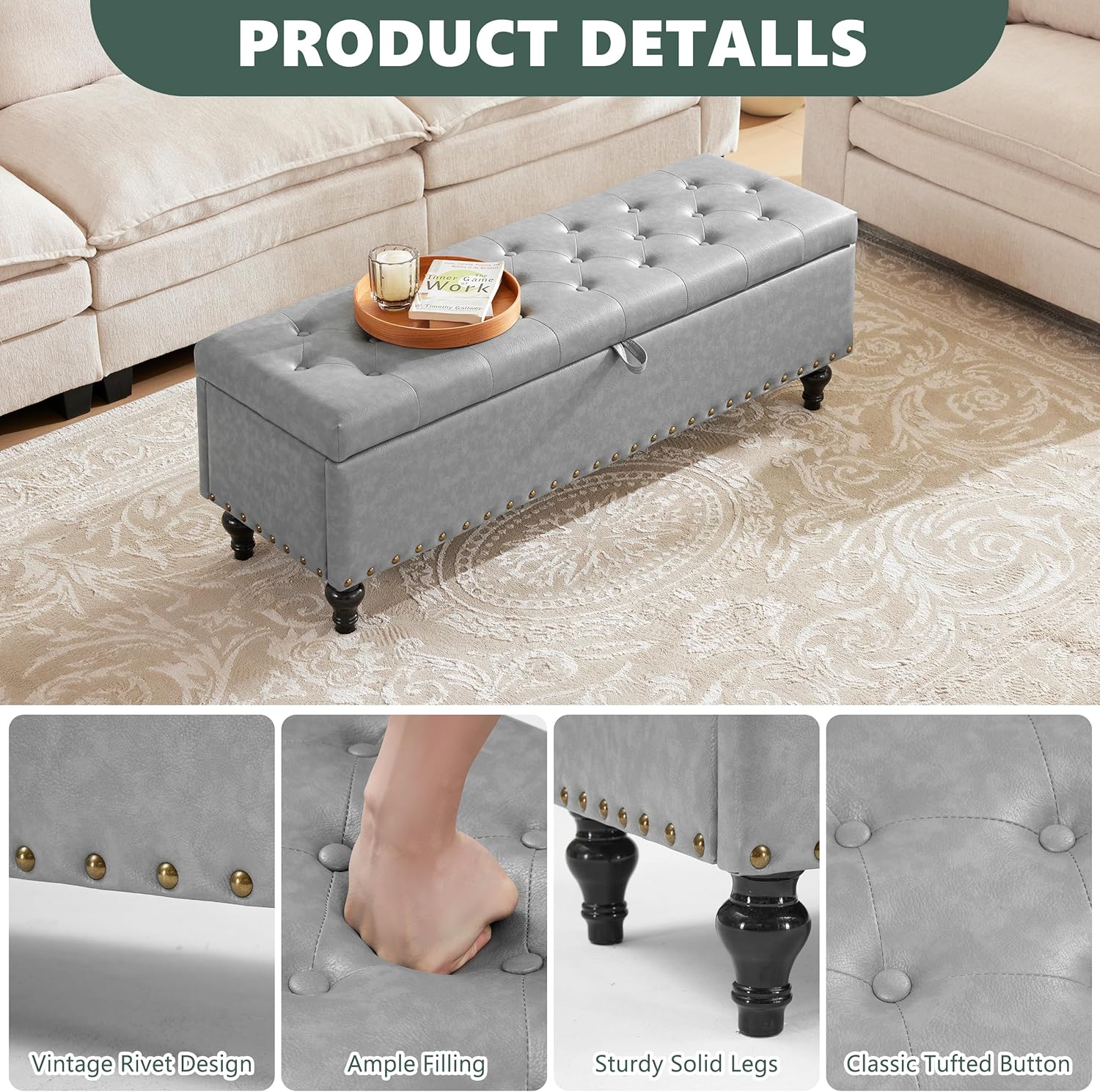 51.8’’ Storage Ottoman Bench, Faux Leather Ottoman with Storages, Window Benches Holds up to 330lbs, Upholstered Storage Bench for Bedroom, Living Room, Entryway and Family Room, Light Gray