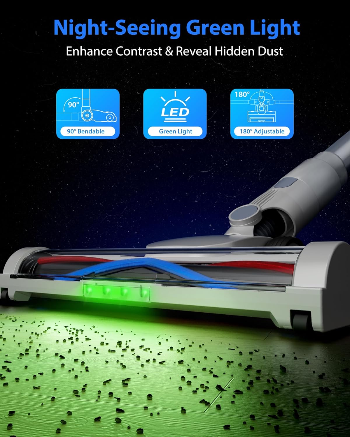 • 𝐒𝐜𝐢𝐞𝐧𝐭𝐢𝐟𝐢𝐜 𝐆𝐫𝐞𝐞𝐧 𝐋𝐢𝐠𝐡𝐭 𝐟𝐨𝐫 𝐂𝐥𝐞𝐚𝐫𝐞𝐫 𝐂𝐥𝐞𝐚𝐧𝐢𝐧𝐠 - The floor brush's 520nm green LED exposes hidden dust while reducing glare. Its adjustable head reaches tight spaces, eliminating furniture-moving hassles.