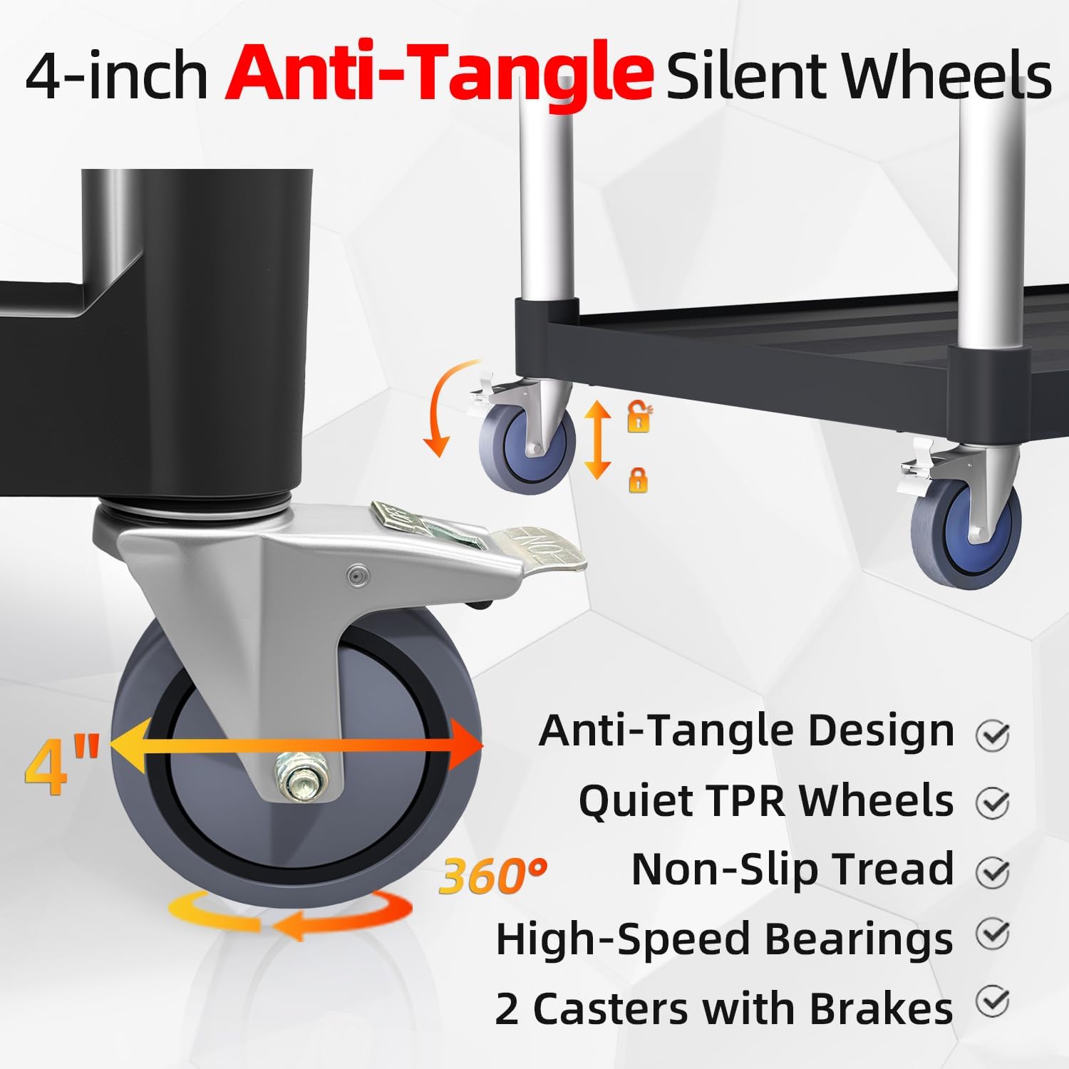 • Effortless & Silent Mobility : Equipped with four TPR anti-tangle casters that absorb vibrations and protect contents. Fully sealed bearings reduce friction and noise for smooth transport. Two lockable wheels provide stationary stability when needed.