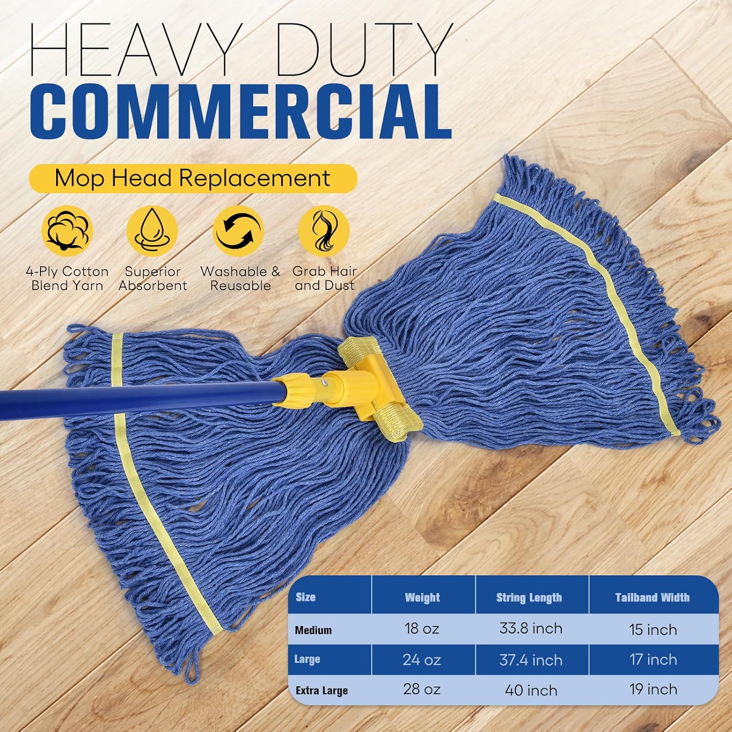 Matthew Cleaning Commercial Mop Head Replacement, 5 Inch Wide Headband, Looped End Cotton Blend String Wet Mops for Floor Cleaning, 24 oz Large, 3-Pack Blue
