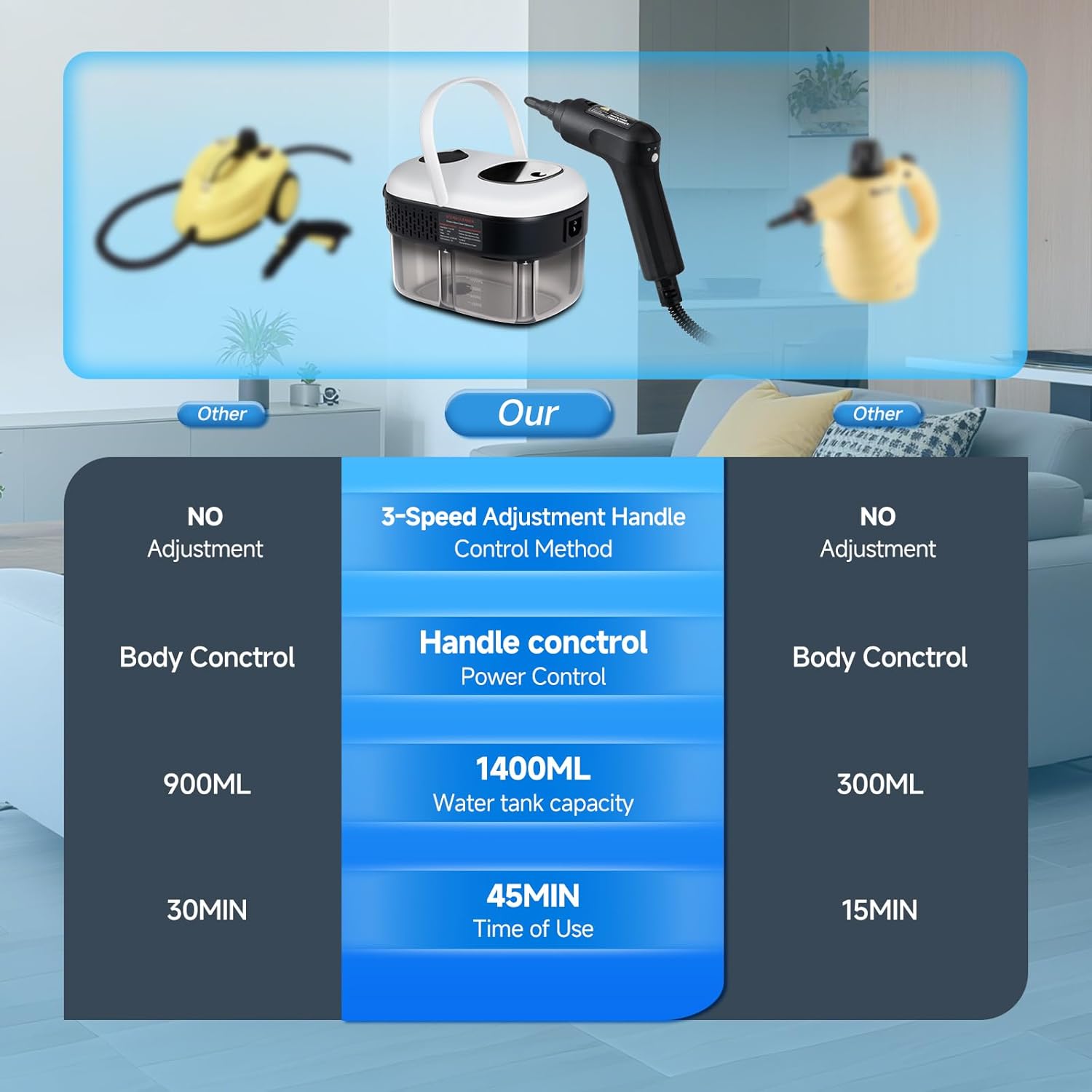 • Handheld Steam Cleaning Handle: This multipurpose home steamer features an upgraded handle remote control with 3 adjustable steam levels and 3 indicator lights to simplify operation, allowing you to easily switch intensity with the press of a button. The built-in equipment screen clearly displays the current steam levels, ensuring precise cleaning for different surfaces.