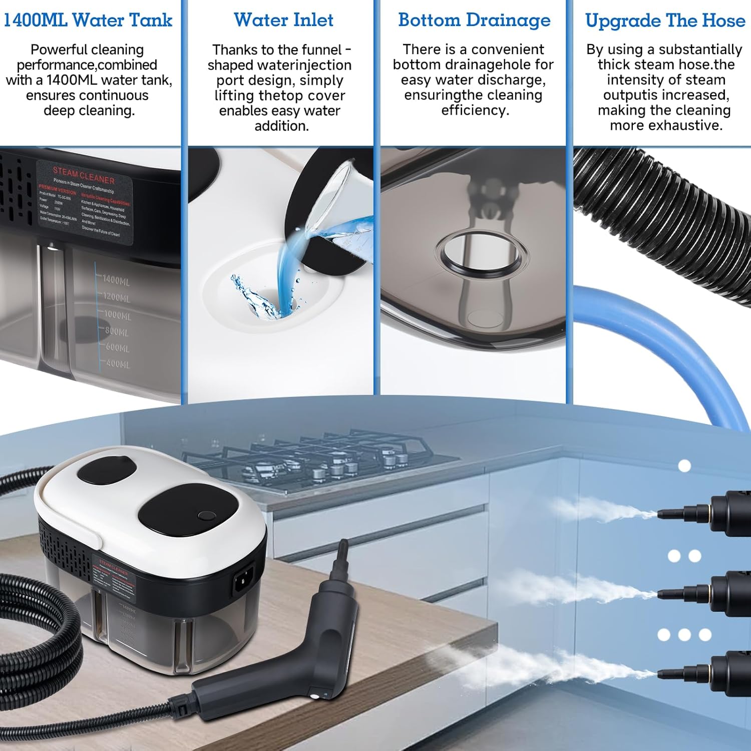 • Steam Cleaner Design: This home steam cleaner features a 1400ML high-capacity tank (45 mins runtime) with top-flip filling for splash-free refills and bottom drainage for easy water disposal. The 78.74 inch extended hose effortlessly reaches ceilings, shower stalls, and under furniture—50% longer than standard models. Paired with anti-leak seals and ergonomic handles, it delivers uninterrupted deep cleaning from floors to high walls without refill hassles.