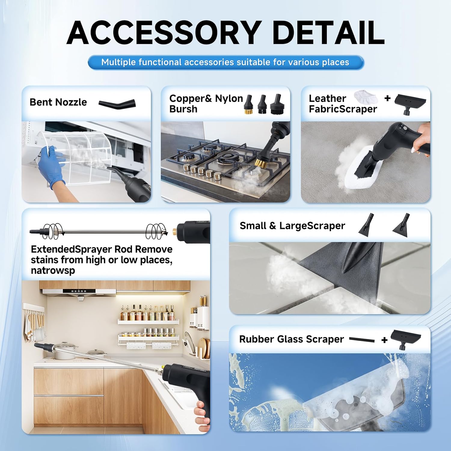 • Steam Cleaner Portable: Multipurpose steam cleaner features a reinforced 78-inch steam hose and 78-inch power cord when tackling stoves, windows, upholstery, and hard-to-reach areas like car interiors. The 9×6×7-inch compact body stores easily yet delivers. Equipped with professional accessories including brass/nylon brushes, extension rod, a glass brush, a microfiber pad, cleaning towels, and gloves, making it commercial-grade cleaning results, allowing you to clean from a distance with ease.