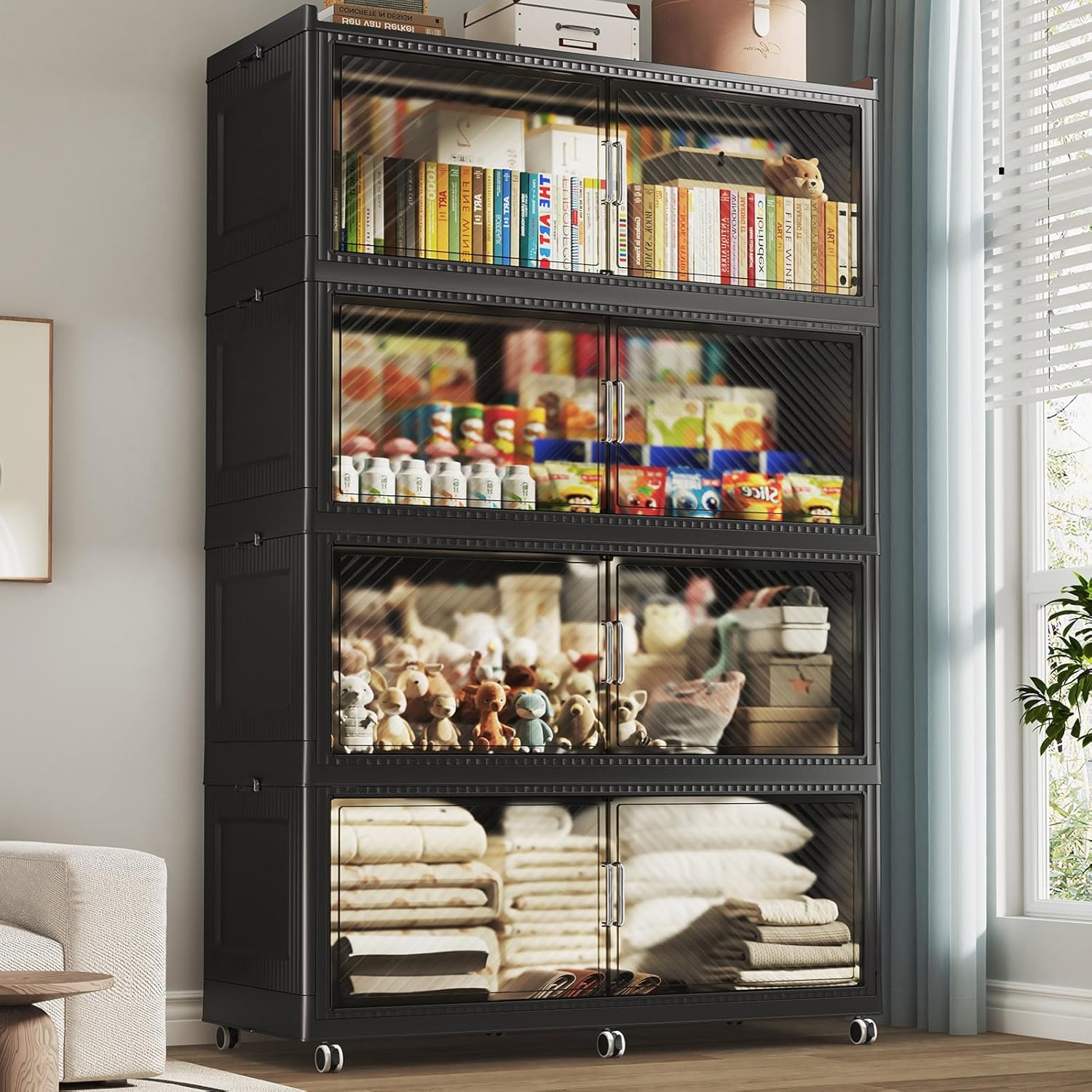 200GAL Extra Large Storage Bins with Lid, 800QT Collapsible Organizer with Wheels, Stackable Closet Cabinet with Doors, Folding Storage Containers for Home, Office, Dorm, 4Pack Black