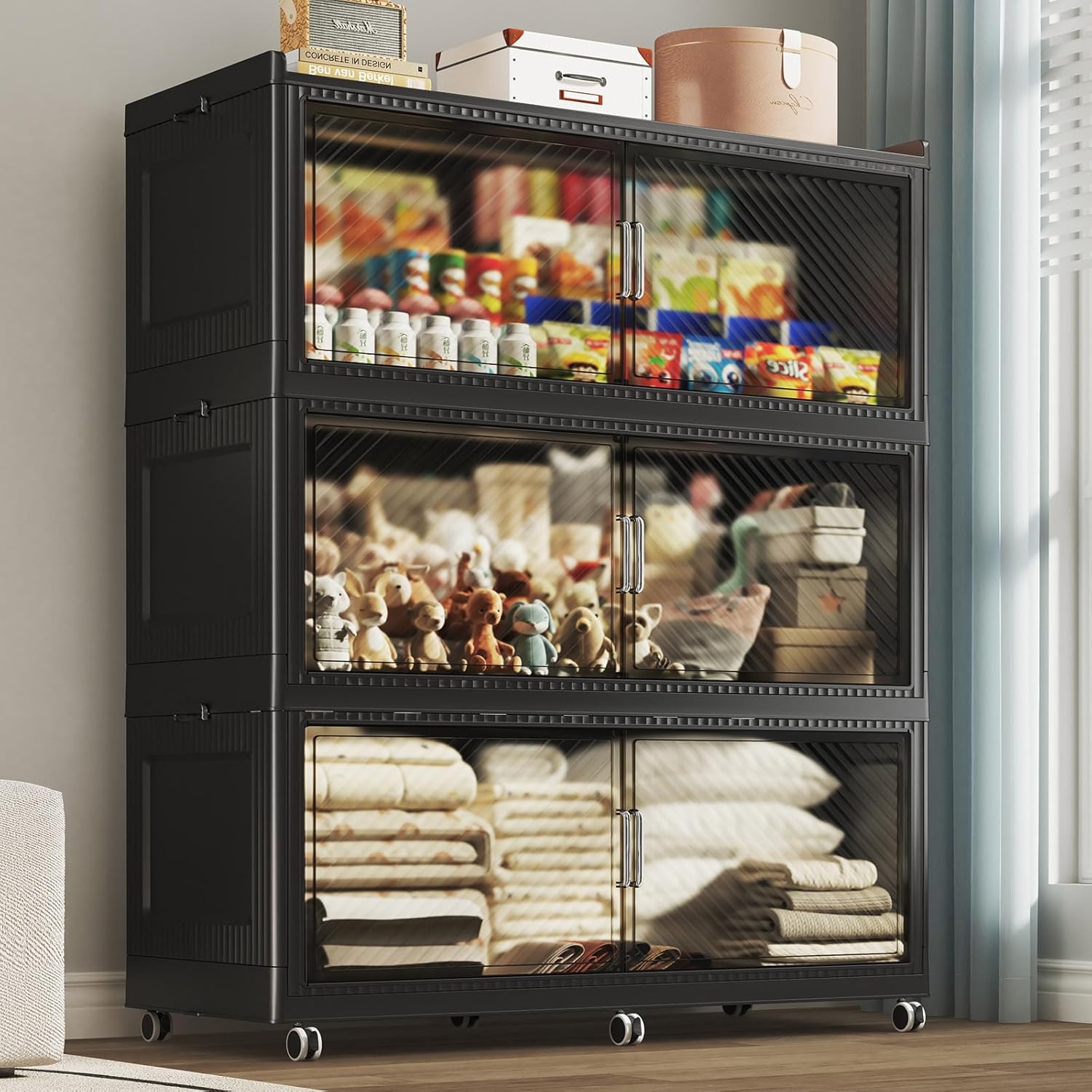 150GAL Extra Large Storage Bins with Lid, 600QT Collapsible Organizer with Wheels, Stackable Closet Cabinet with Doors, Folding Storage Containers for Home, Office, Dorm, 3Pack Black