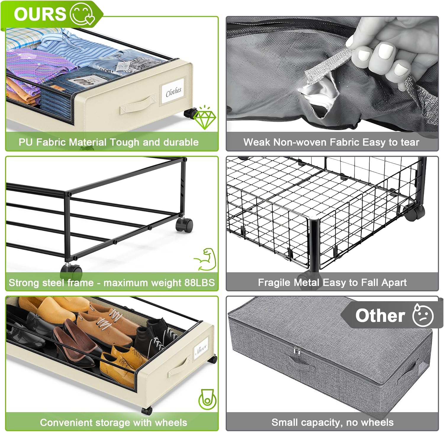 • 【360° Rotating Wheels】: Our Under the bed Storage Organizer is equipped with 2 side handle and 4 smooth 360° universal wheels that glide effortlessly on various surfaces, making it ideal for use in bedrooms, living rooms, shoe cabinets, basements, dormitories, lofts and other places. By removing the metal frame and wheels at the bottom, the under bed storage bins can be placed flat on top of or inside the wardrobe.