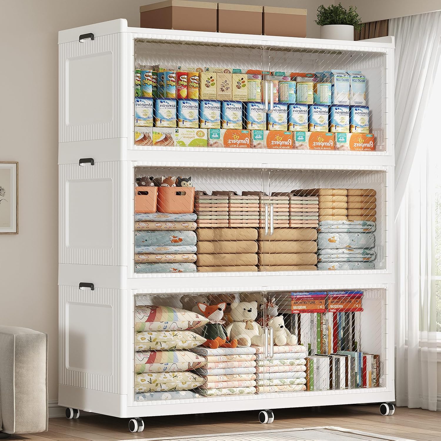 240GAL Extra Large Storage Bins with Lid, 960QT Collapsible Organizer with Wheels, Stackable Closet Cabinet with Doors, Folding Storage Containers for Home, Office, Dorm, 3Pack White