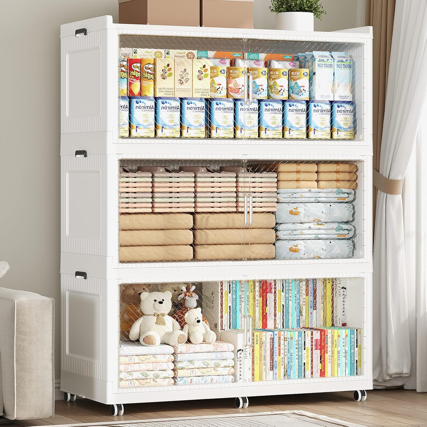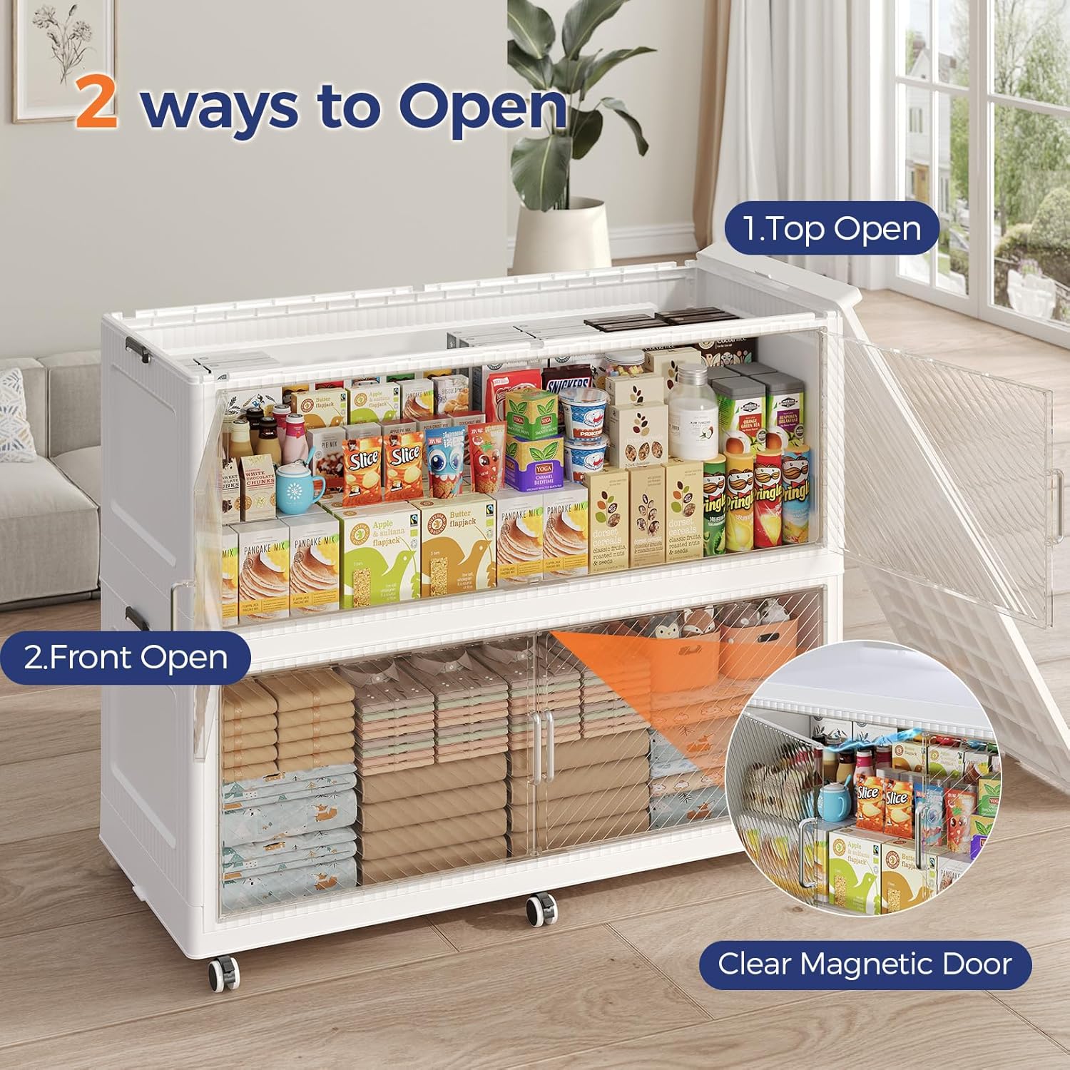 • 【Two Ways to Open & Magnetic Doors】The collapsible storage bins with lids and wheels feature a dual access way, allowing for both top and front door openings, and with clear brown windows for easy visibility. The super huge storage bins with open front doors are equipped with magnetic lock buckles to prevent dust from entering the cabinet.