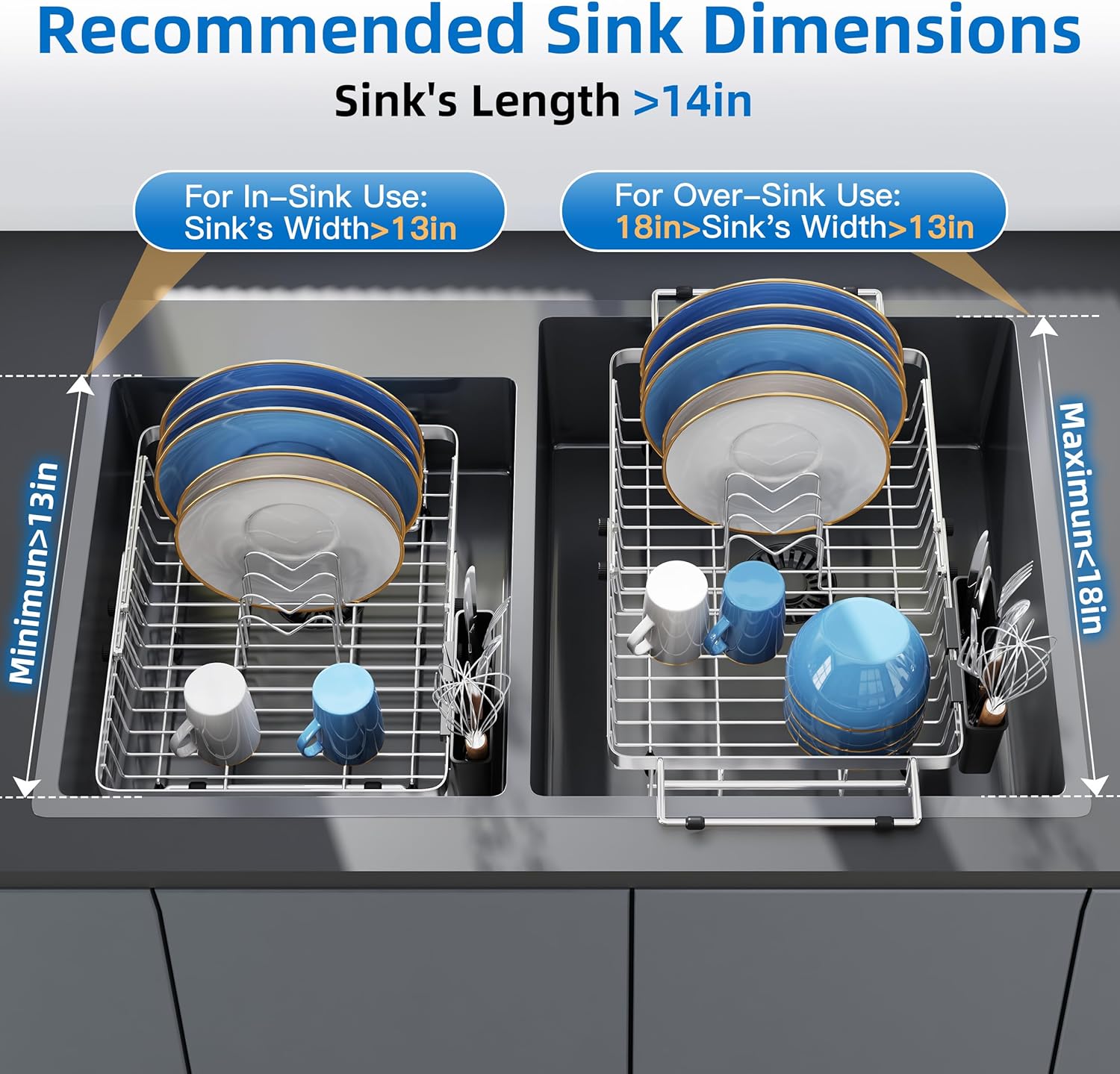 • 🔄Expandable & Space Saving Design: Width adjusts from 11.4" to 17.5" to fit most sinks single, double thick and rim. This expandable dish drying rack over your sink, maximizing counter space saving. Stainless steel dish drying rack holds plates cups firmly with non slip silicone pads. Ideal compact dish drying rack for small households.
