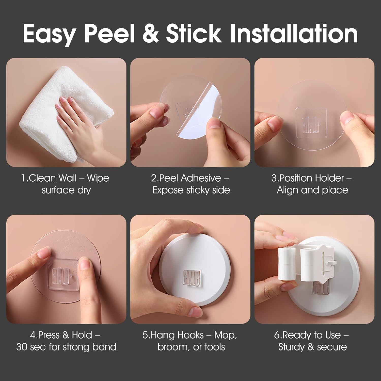 • No Drilling & Easy Installation – Use the self-adhesive backing to mount on walls without making holes. Quick installation in 6 simple steps: clean wall, peel off adhesive, press firmly, and hang mop.
