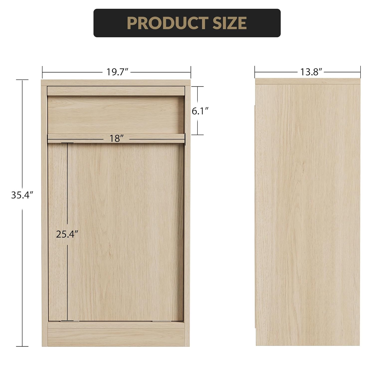 • Ample Storage Space: Measuring 19.7"L x 13.8"W x 35.4"H, this cabinet fits a 10-gallon trash can and features two compartments—an upper drawer for easy access and a lower tilt-out section for hidden waste. The tilt-out door opens up to 30°, making trash disposal effortless.