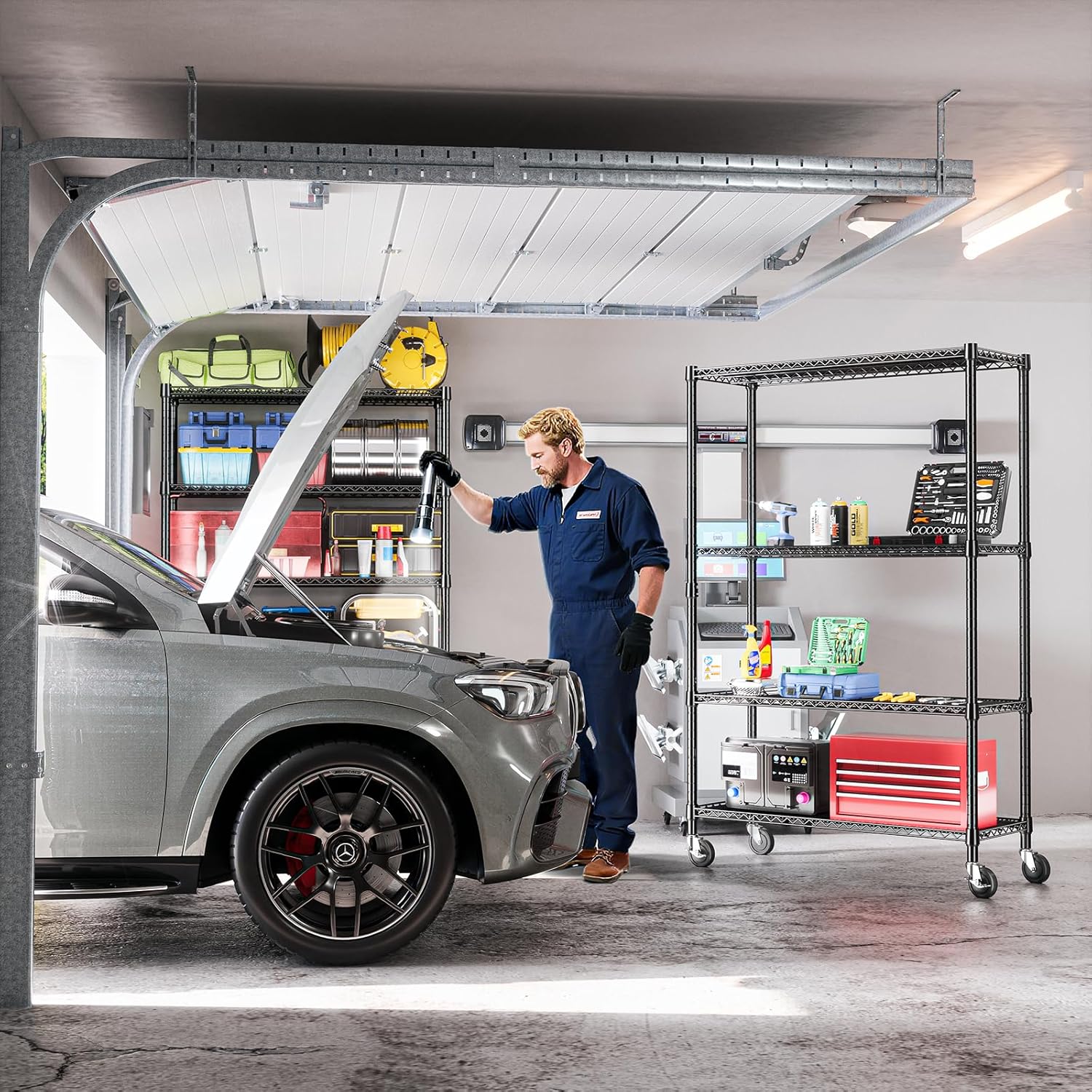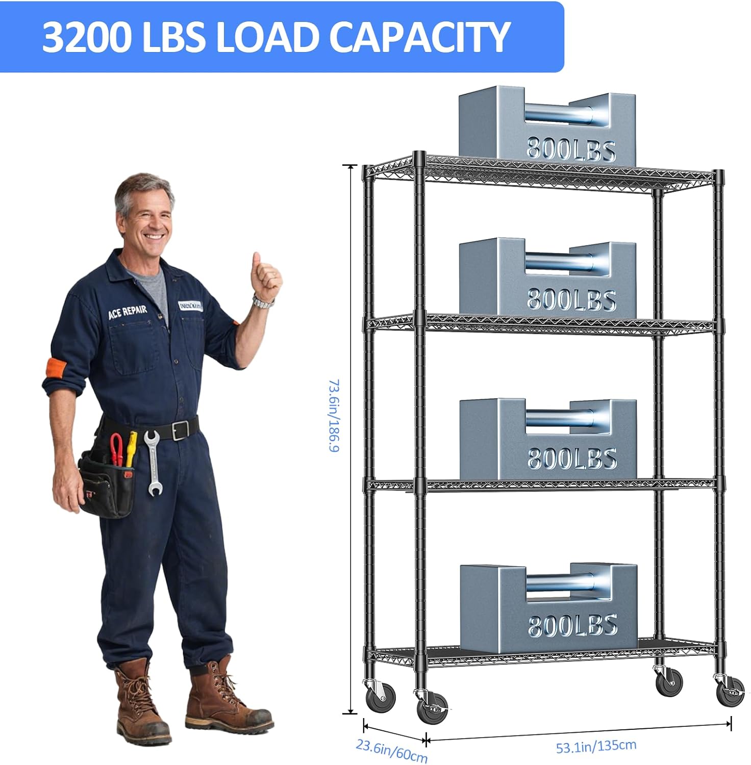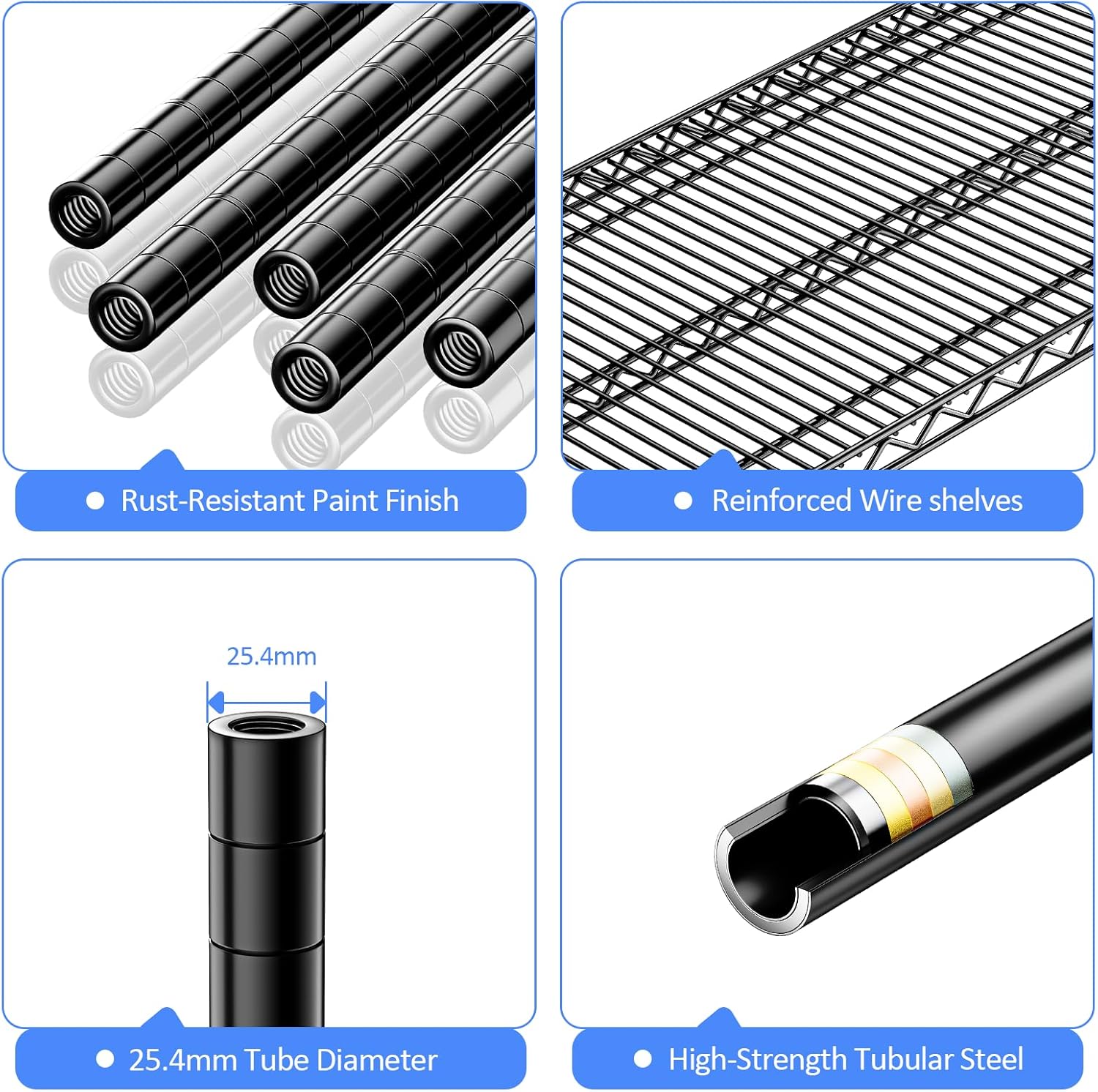 • COMMERCIAL-GRADE HEAVY DUTY – Built with premium carbon steel and 25.4mm thick metal rods, each shelf supports up to 660 lbs on leveling feet, with a total capacity of 2200 lbs (approx. 530 lbs on wheels). Perfect for heavy-duty storage needs.