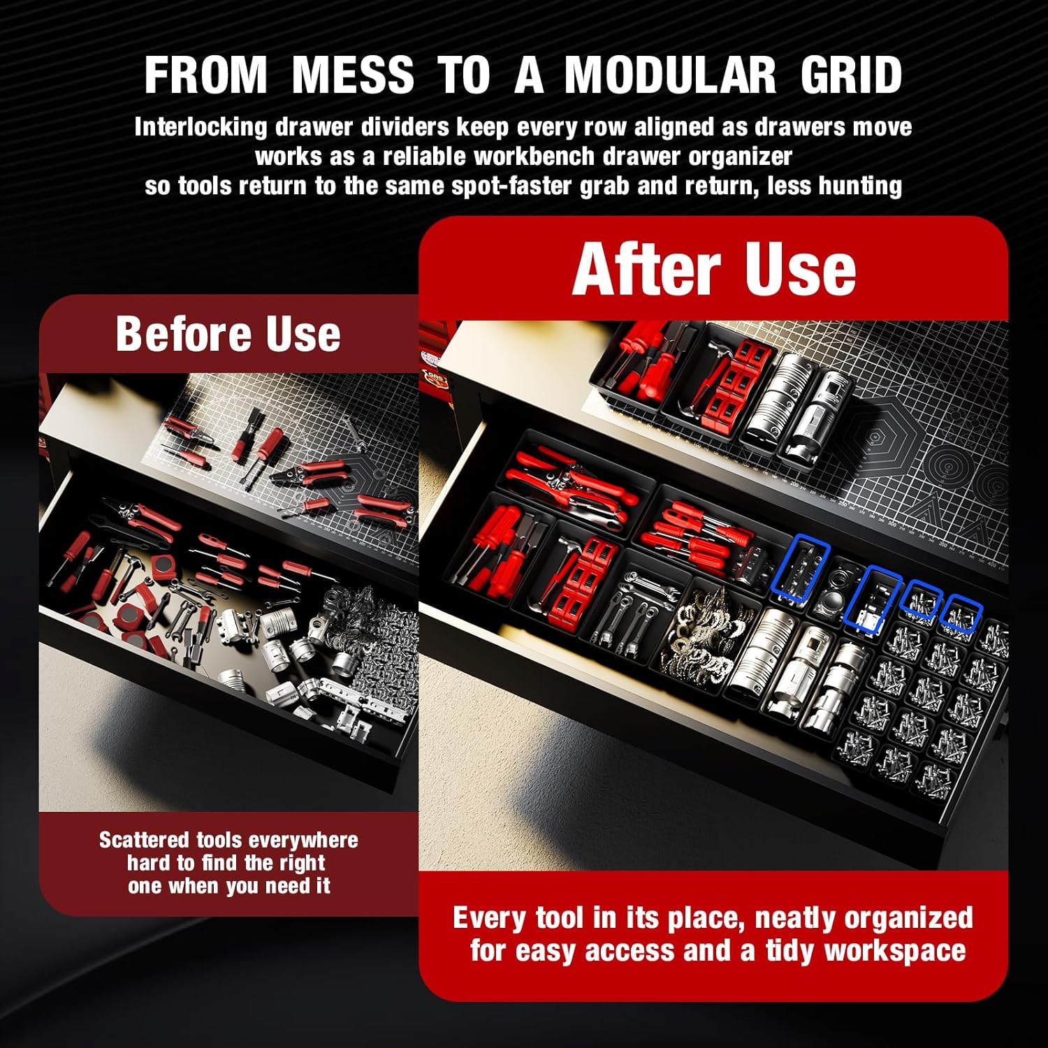 • 【Interlocking Modular Design for Flexible Layout】 Interlocking drawer organizer design allows stacking or separate use, maximizing space in garage drawer organizers, tool box dividers, tool cart compartments, and workbench organizers. Supports modular setups like toolbox organizers and storage, tool grid organizer for tool box, or tool box accessories.