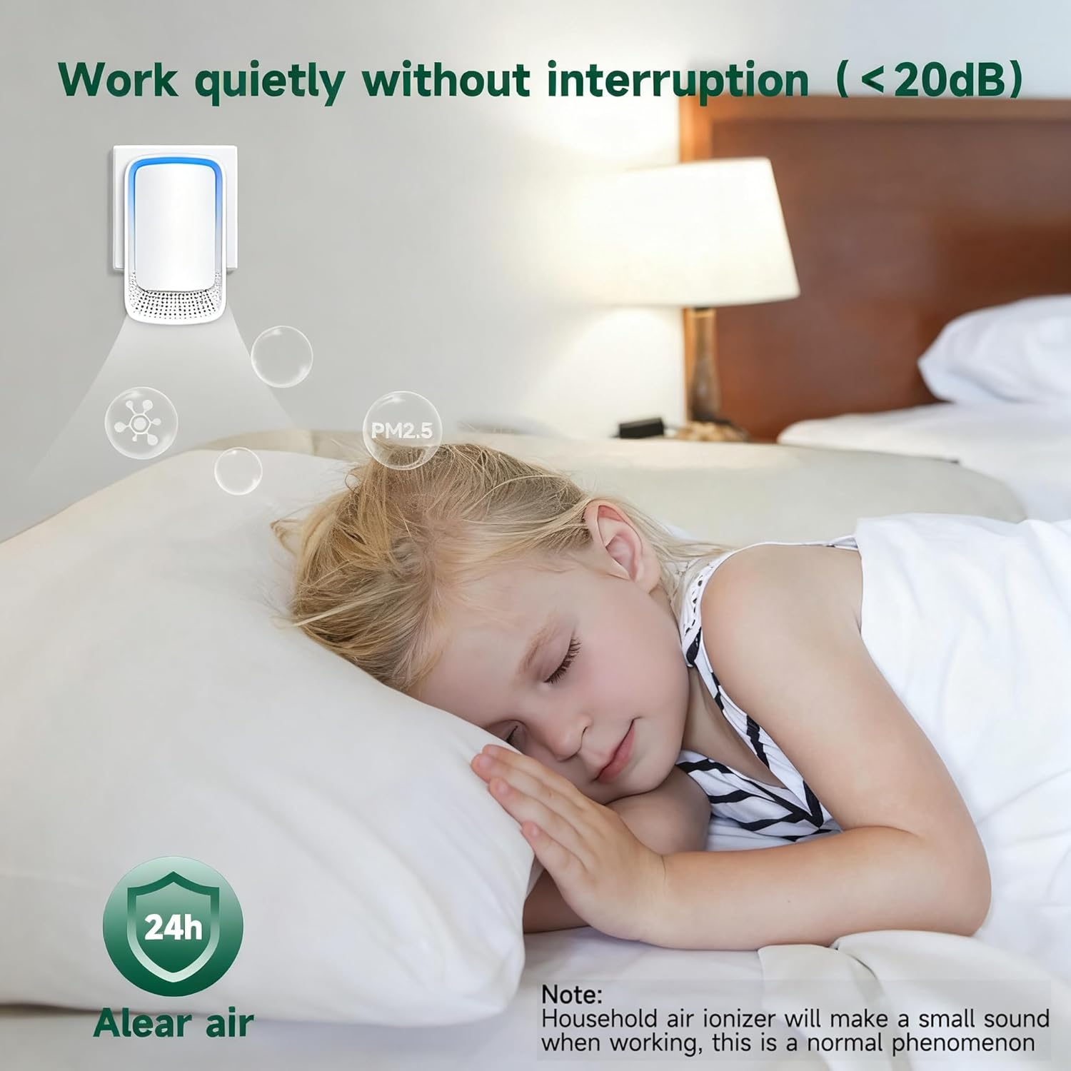 • Silent Operation:Negative ion generator Low power consumption, safer and more energy efficient.Designed for harmonious home environments, this compact negative ion purifier operates virtually silently. Simply plug it in for continuous background operation, safeguarding your peaceful and relaxing space.