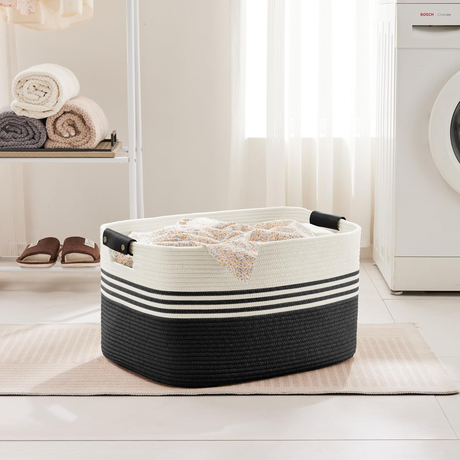 72L Large Laundry Basket with Leather Handles for Living Room Storage, Woven Rope Baskets Bin for Blanket, Kids Toy, Gifts, Wicker Hamper for Bedroom Dirty Clothes, 22"x17"x12" White Black